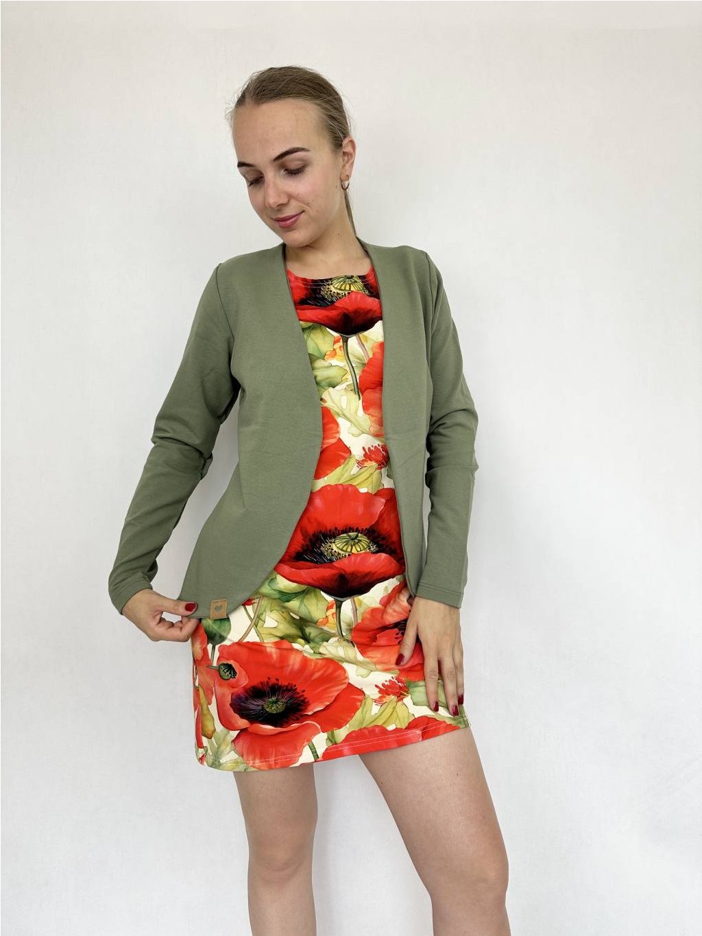 Šaty jsou kombinované s blejzrem KHAKI.