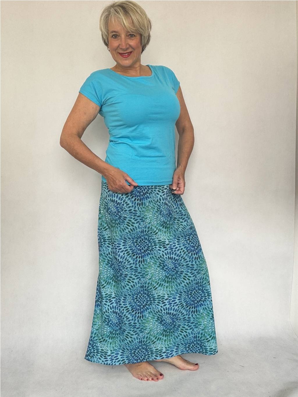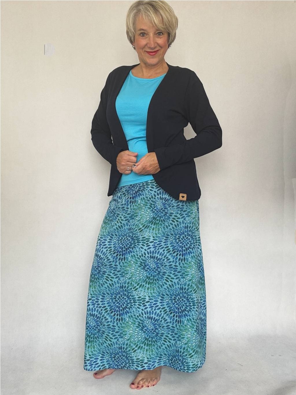 - Sukně má rozparek dlouhý 43 cm, v pase je všitý elastický náplet.