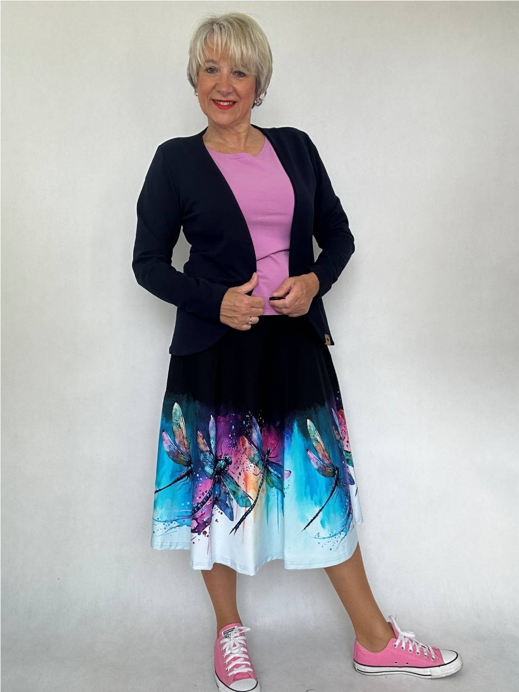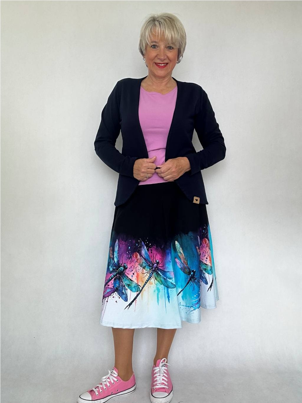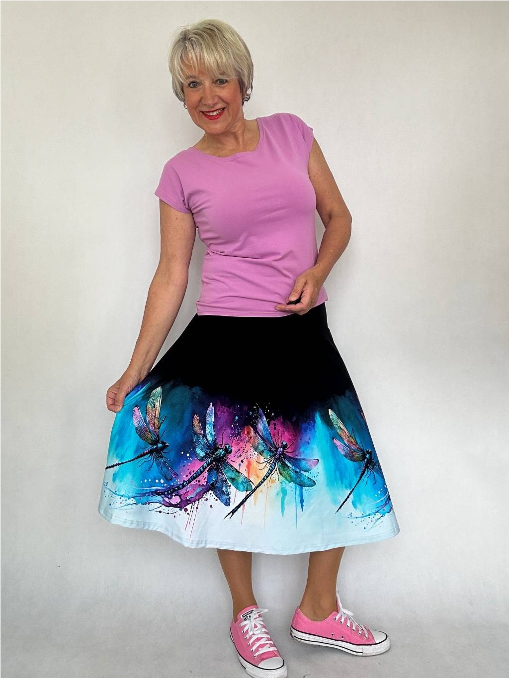 Délka sukně se liší podle tisku, v pase je pružný náplet s otvorem na vložení gumy.