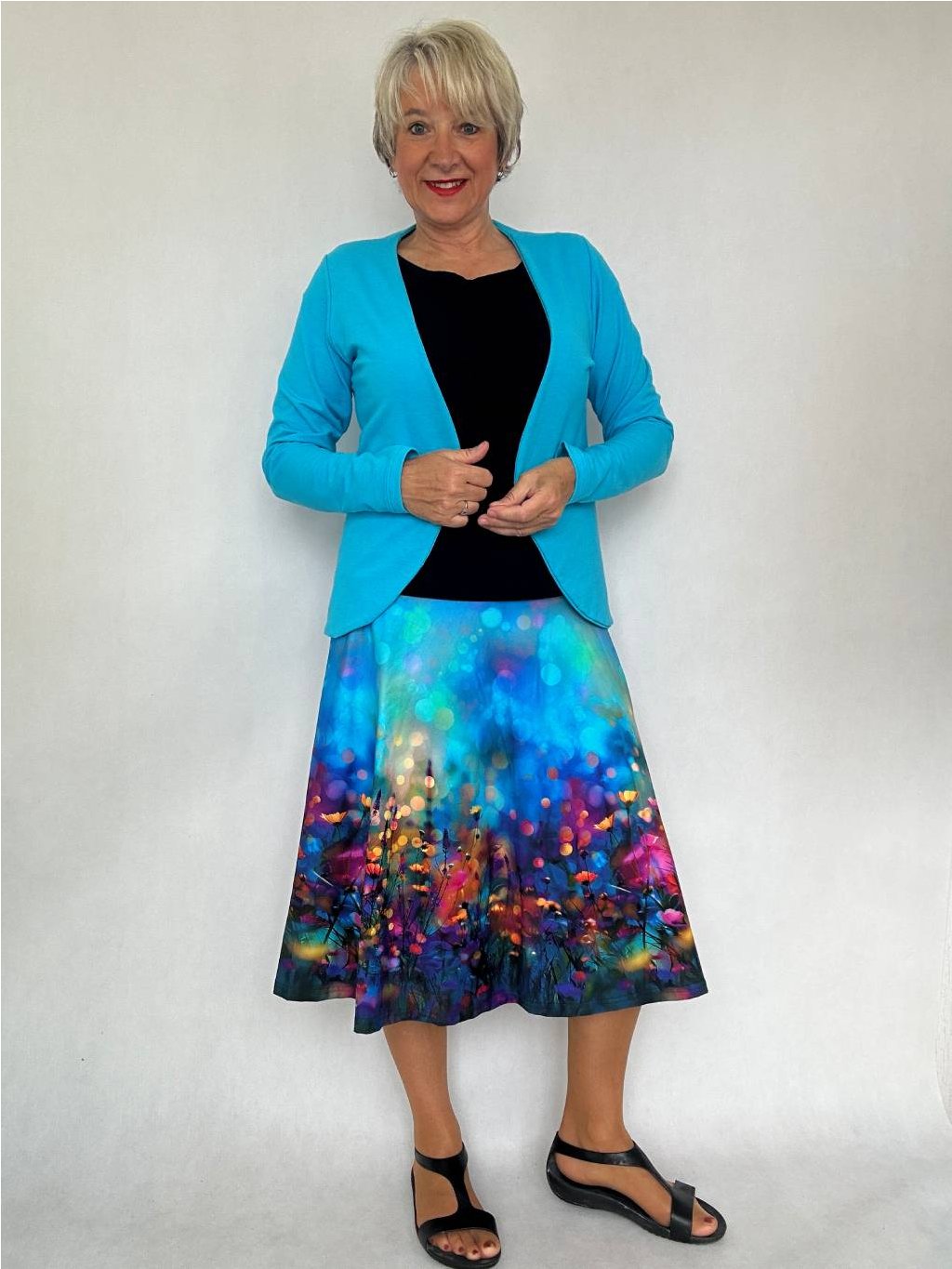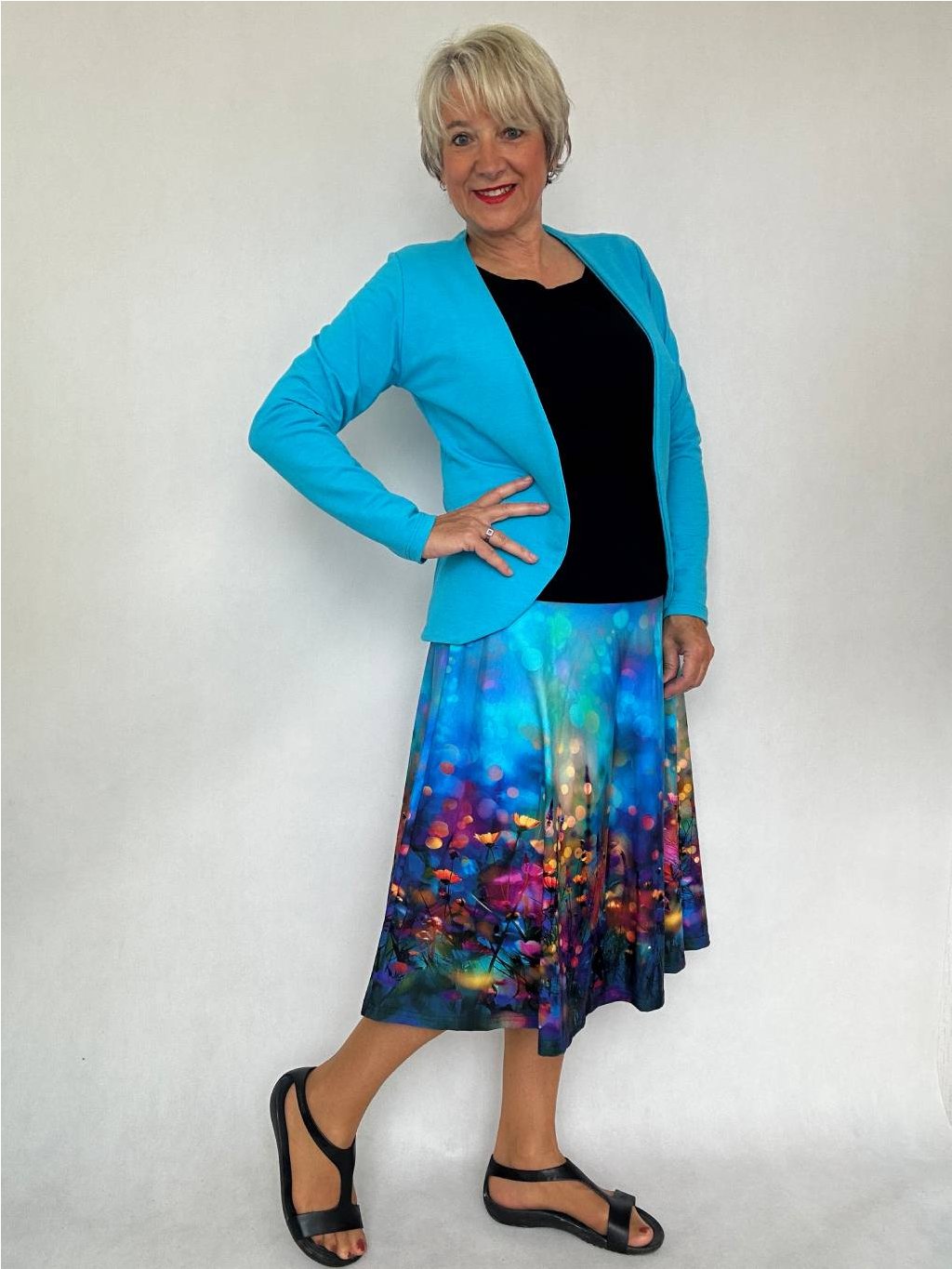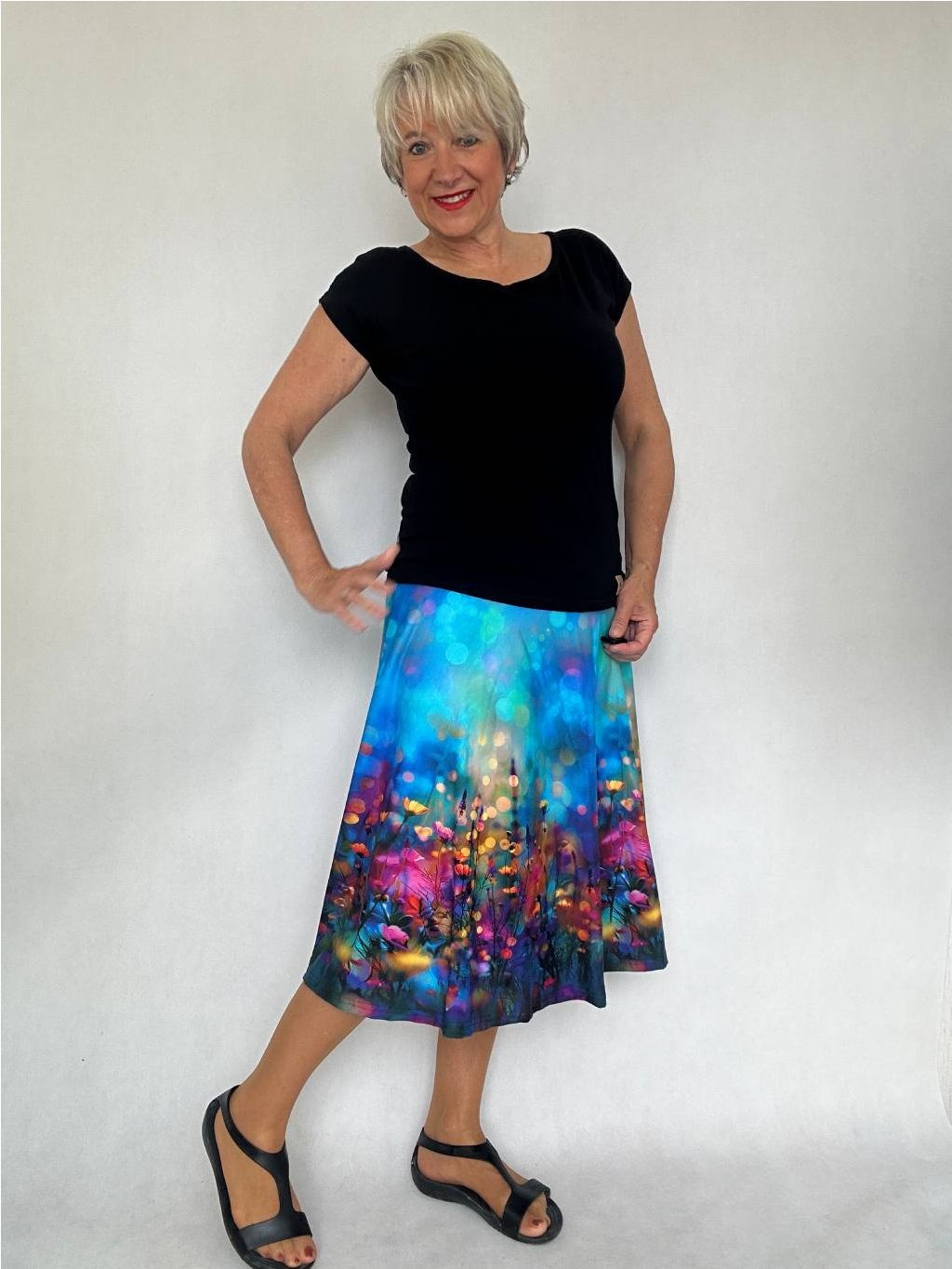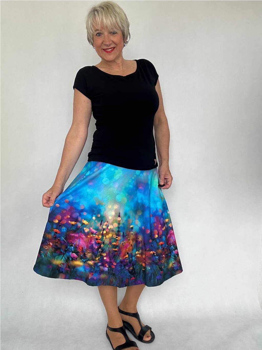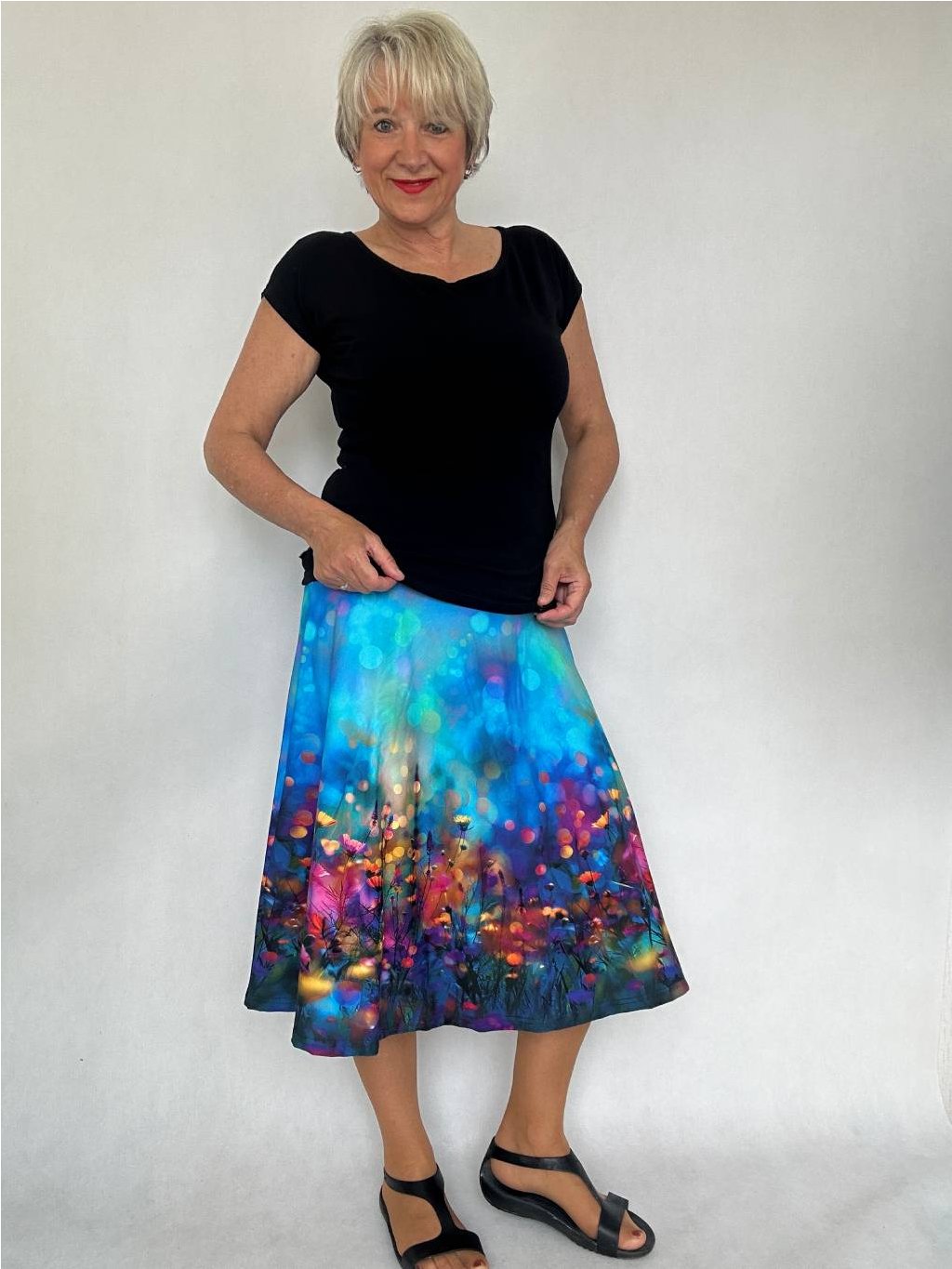 Délka sukně se liší podle tisku, v pase je pružný náplet s otvorem na vložení gumy.