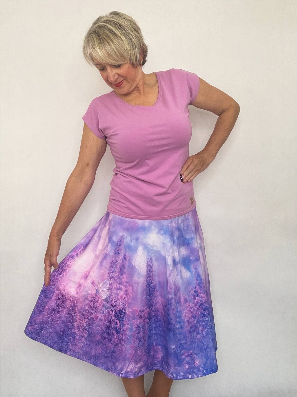 Délka sukně se liší podle tisku, v pase je pružný náplet s otvorem na vložení gumy.