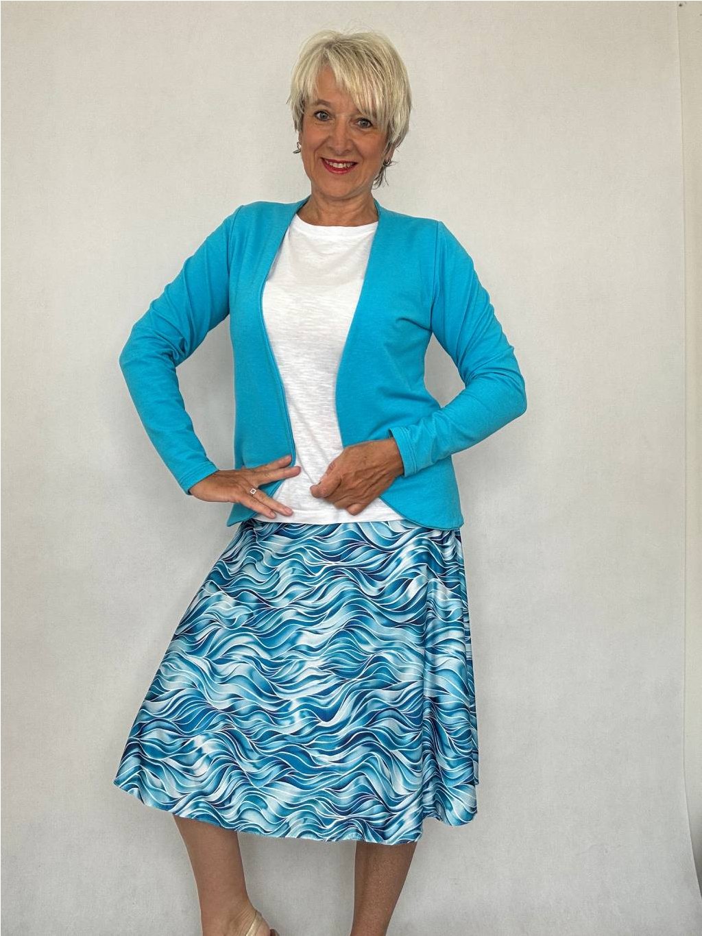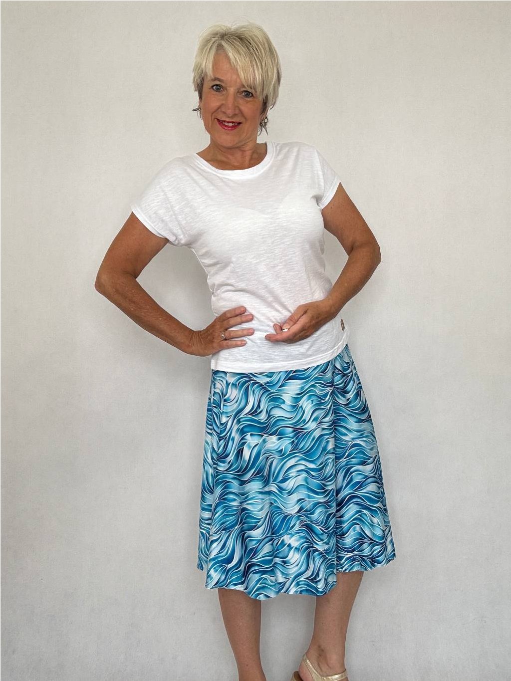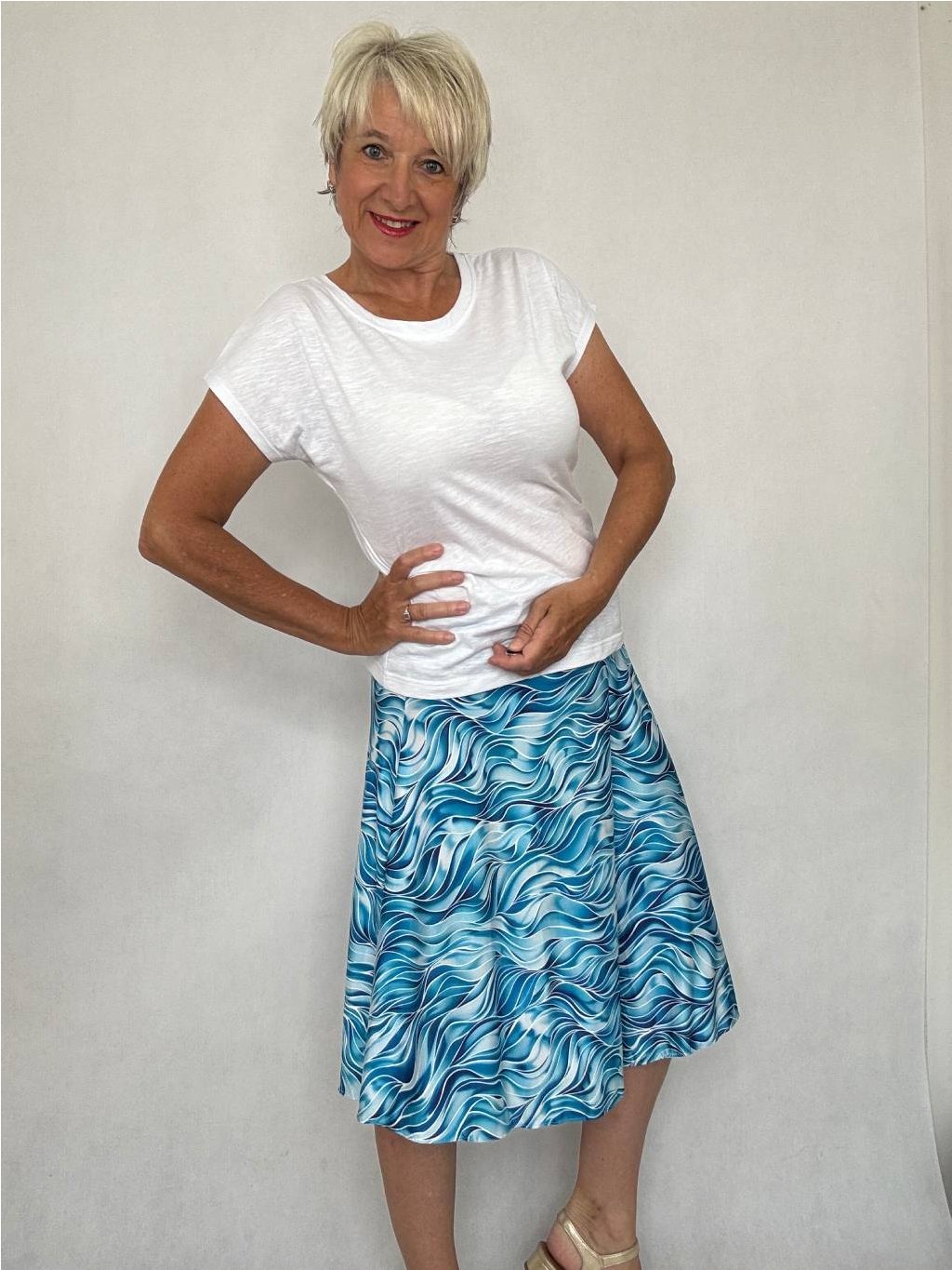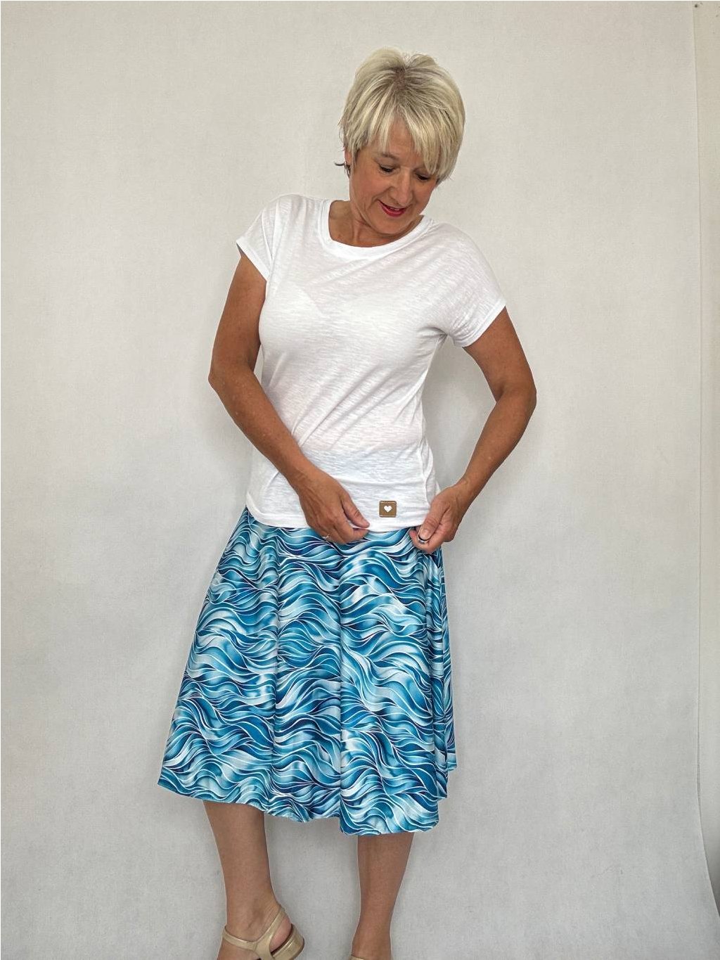 - V pase je pružný náplet (šířka 7 cm) – lze jej přehnout napůl a délku sukně tak ještě zkrátit