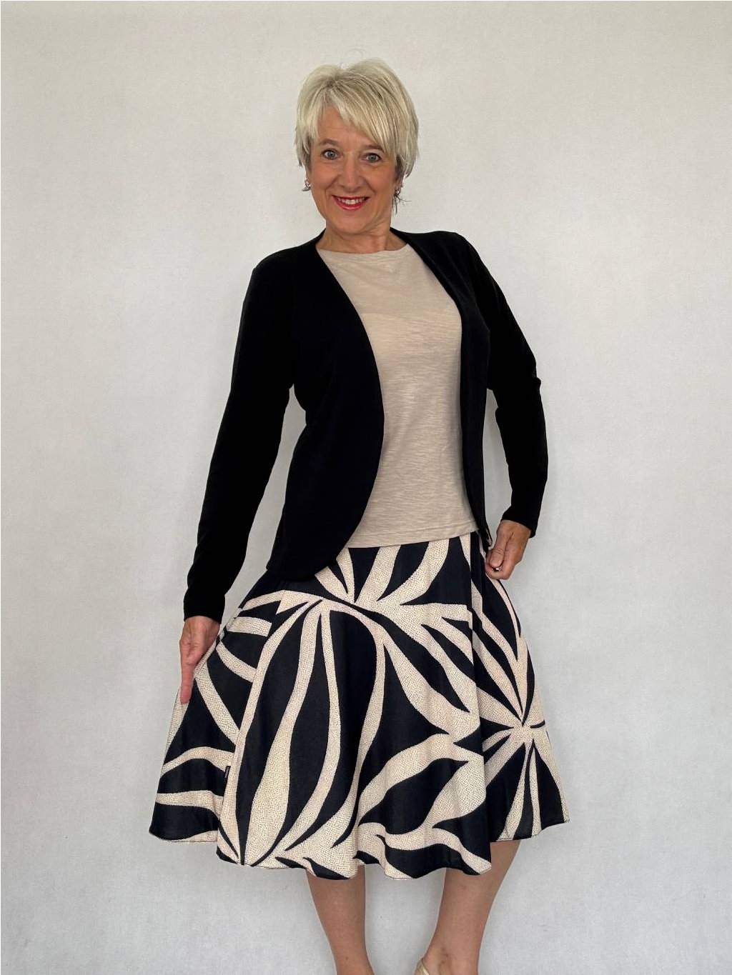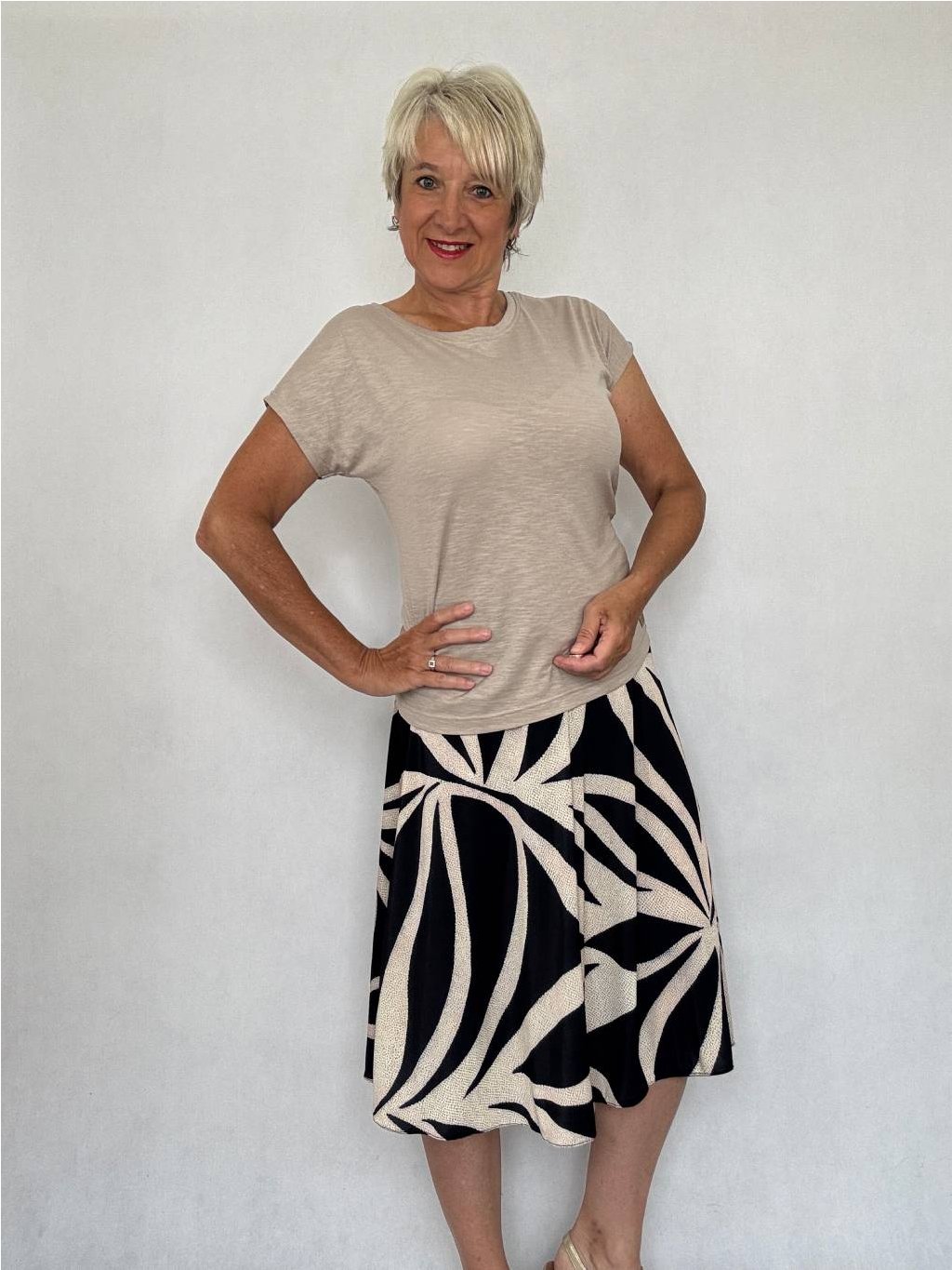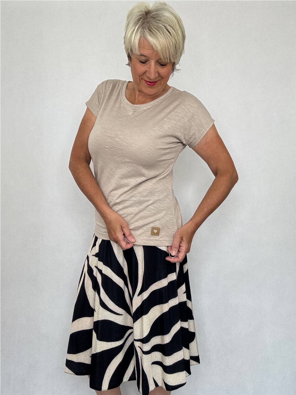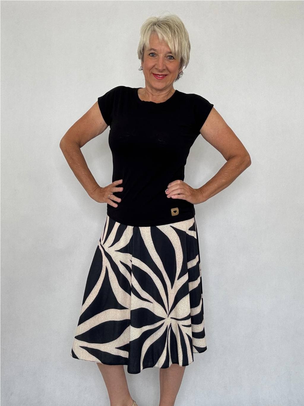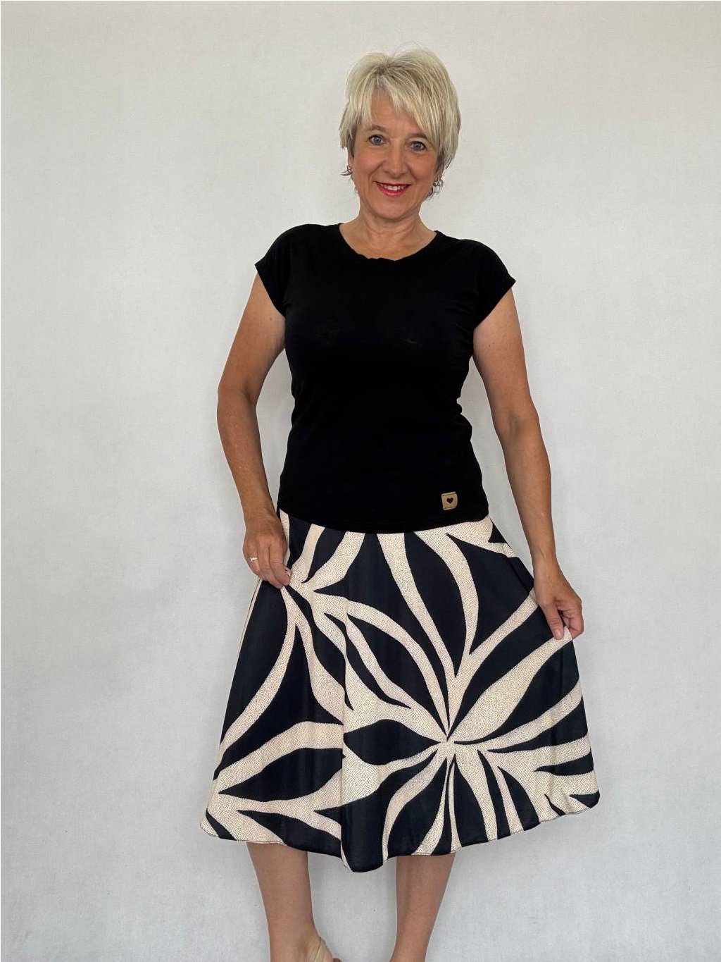 Délka sukně se liší podle tisku, v pase je pružný náplet s otvorem na vložení gumy.