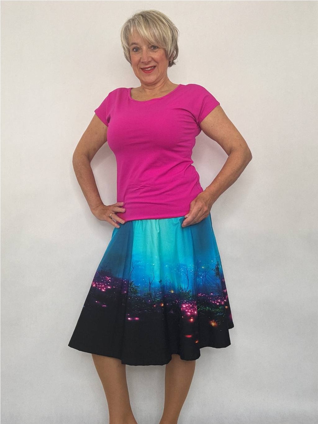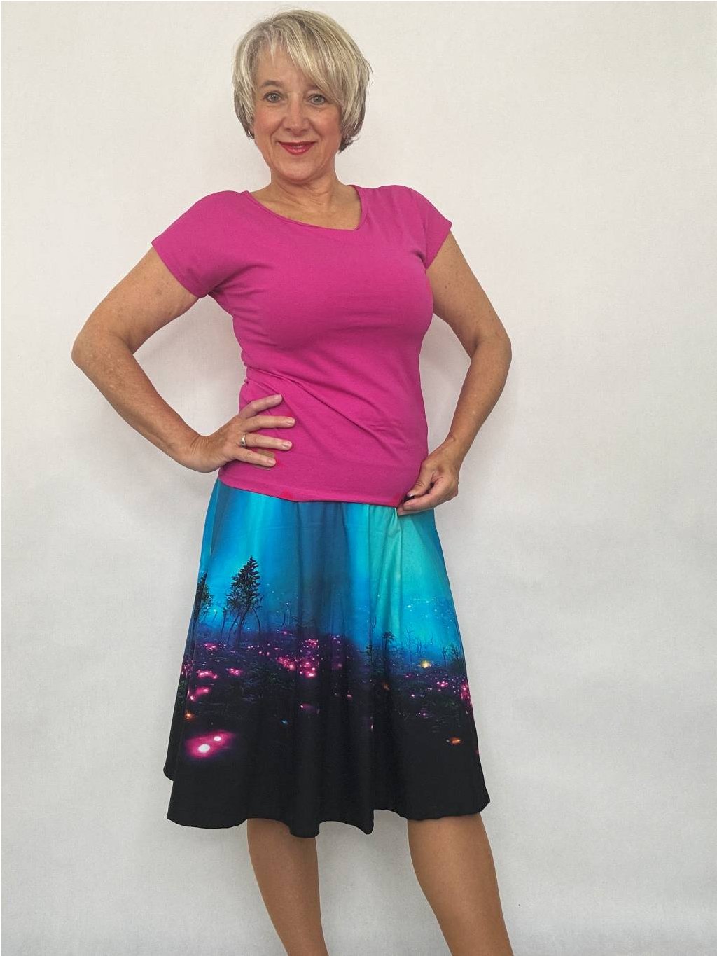 Délka sukně se liší podle tisku, v pase je pružný náplet s otvorem na vložení gumy.