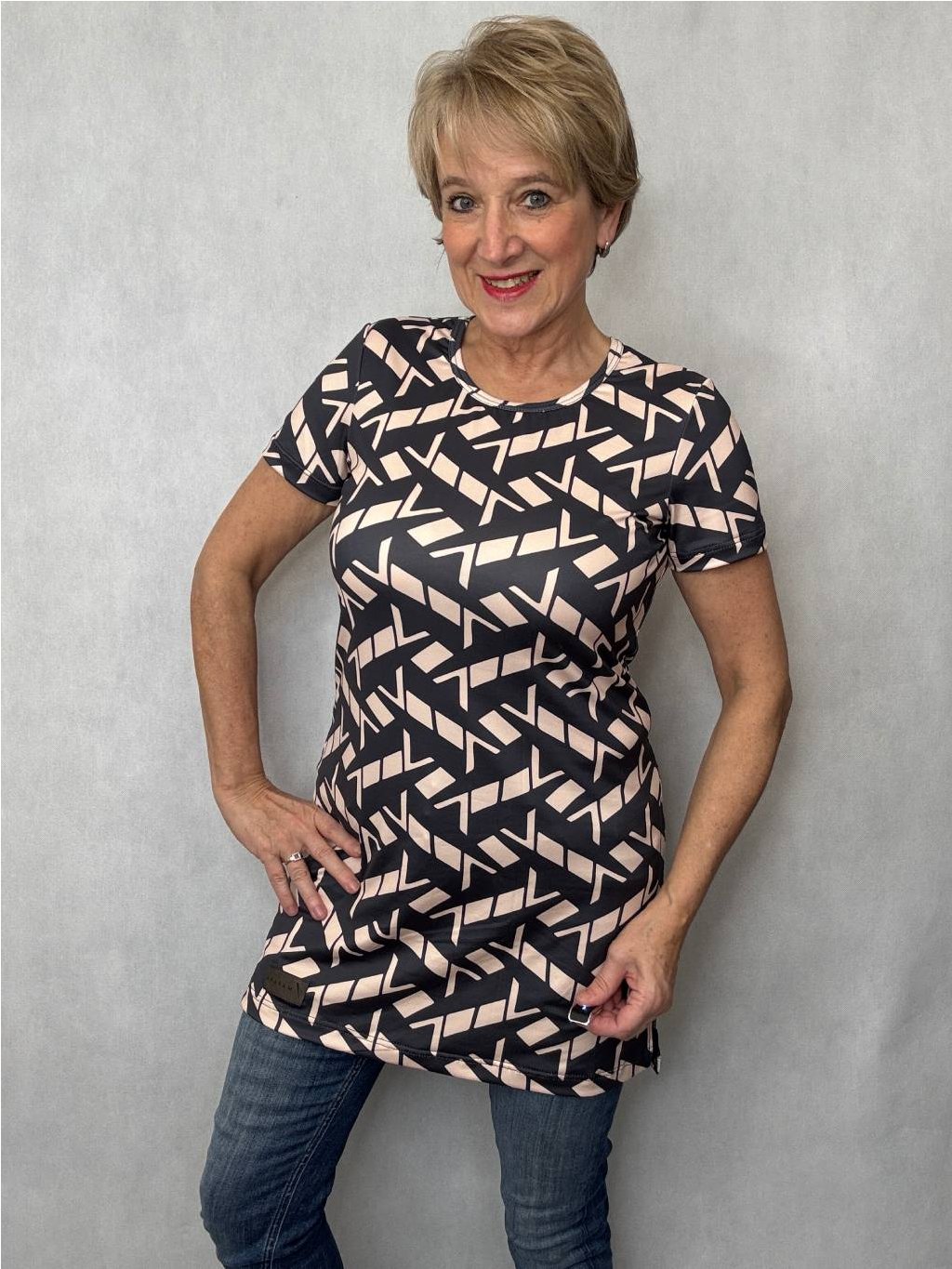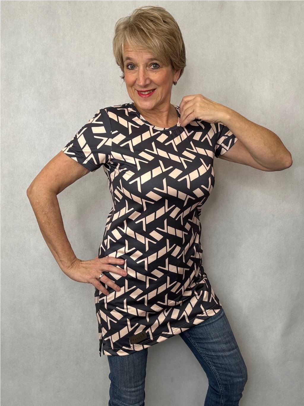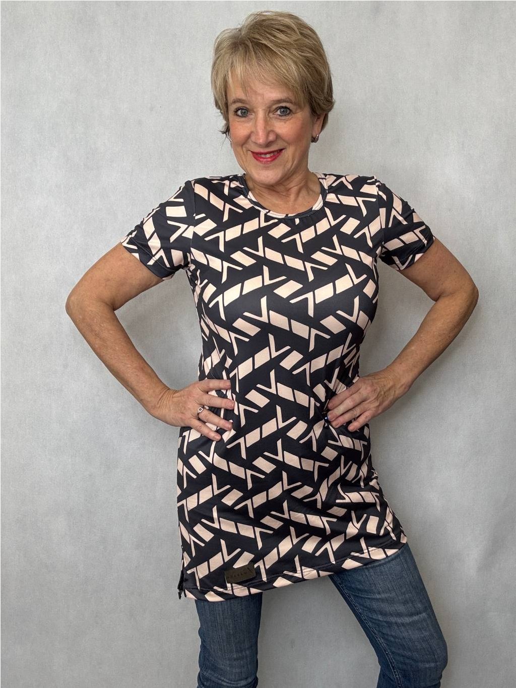 Modelka měří 162 cm a má na sobě velikost M (prsa 98 cm, pas 84cm, boky 102 cm)