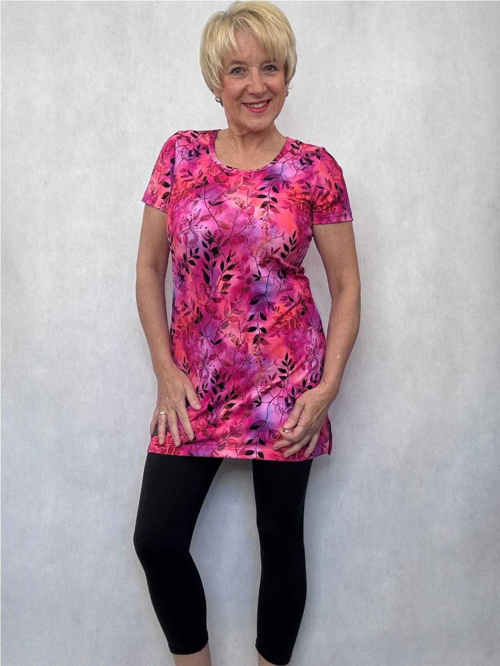 Modelka měří 162 cm a má velikost M (prsa 98 cm, pas 84cm, boky 102 cm)