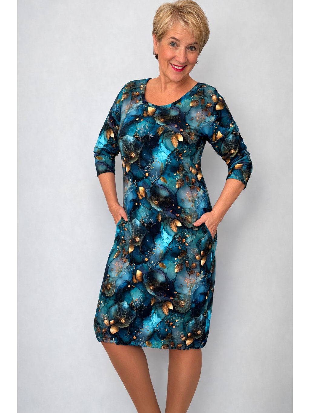 Modelka měří 162 cm a má velikost M (prsa 98 cm, pas 84cm, boky 102 cm)