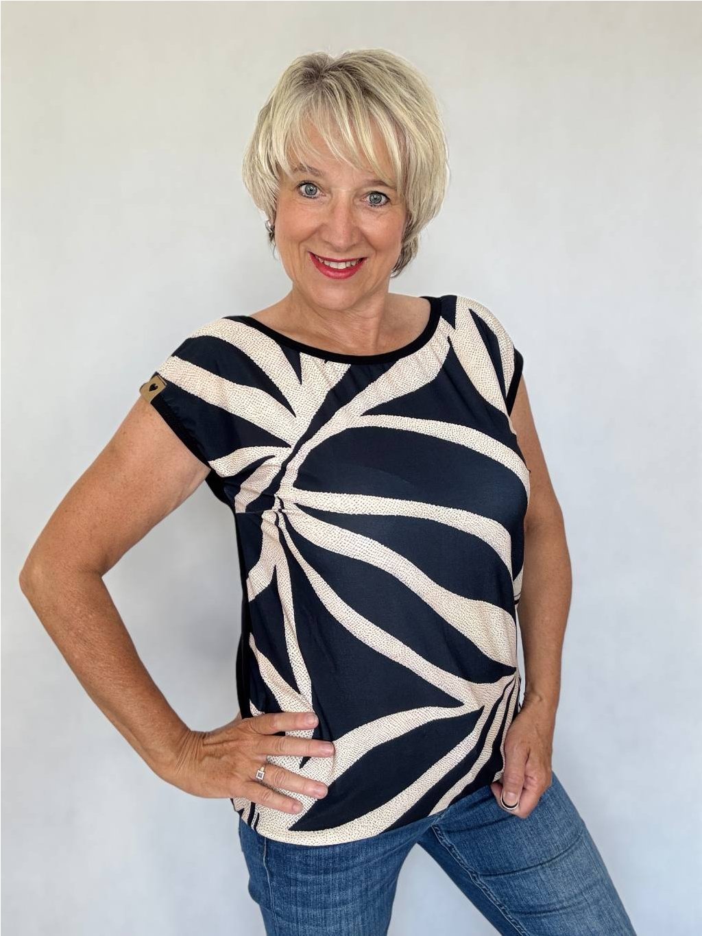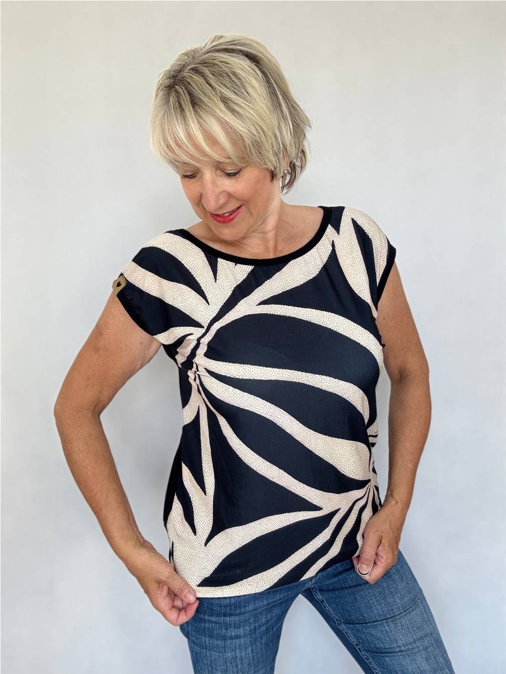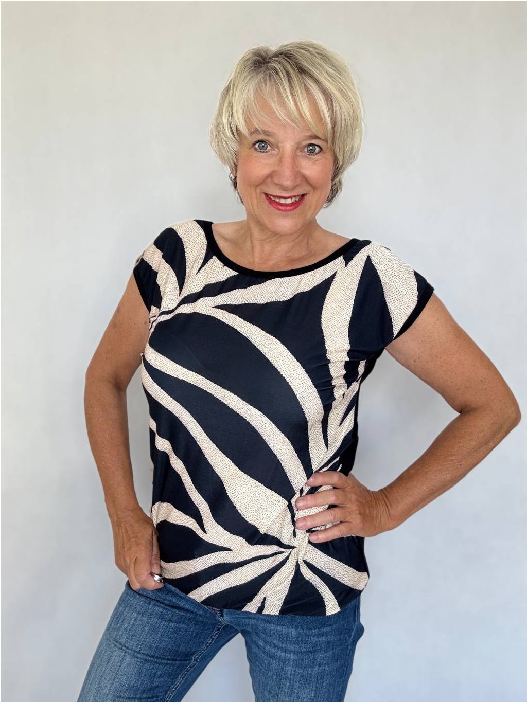 Díky jemnému pružnému stažení dole vytváří tričko podkasaný efekt, který elegantně maskuje případné nedostatky, jako je třeba větší bříško.