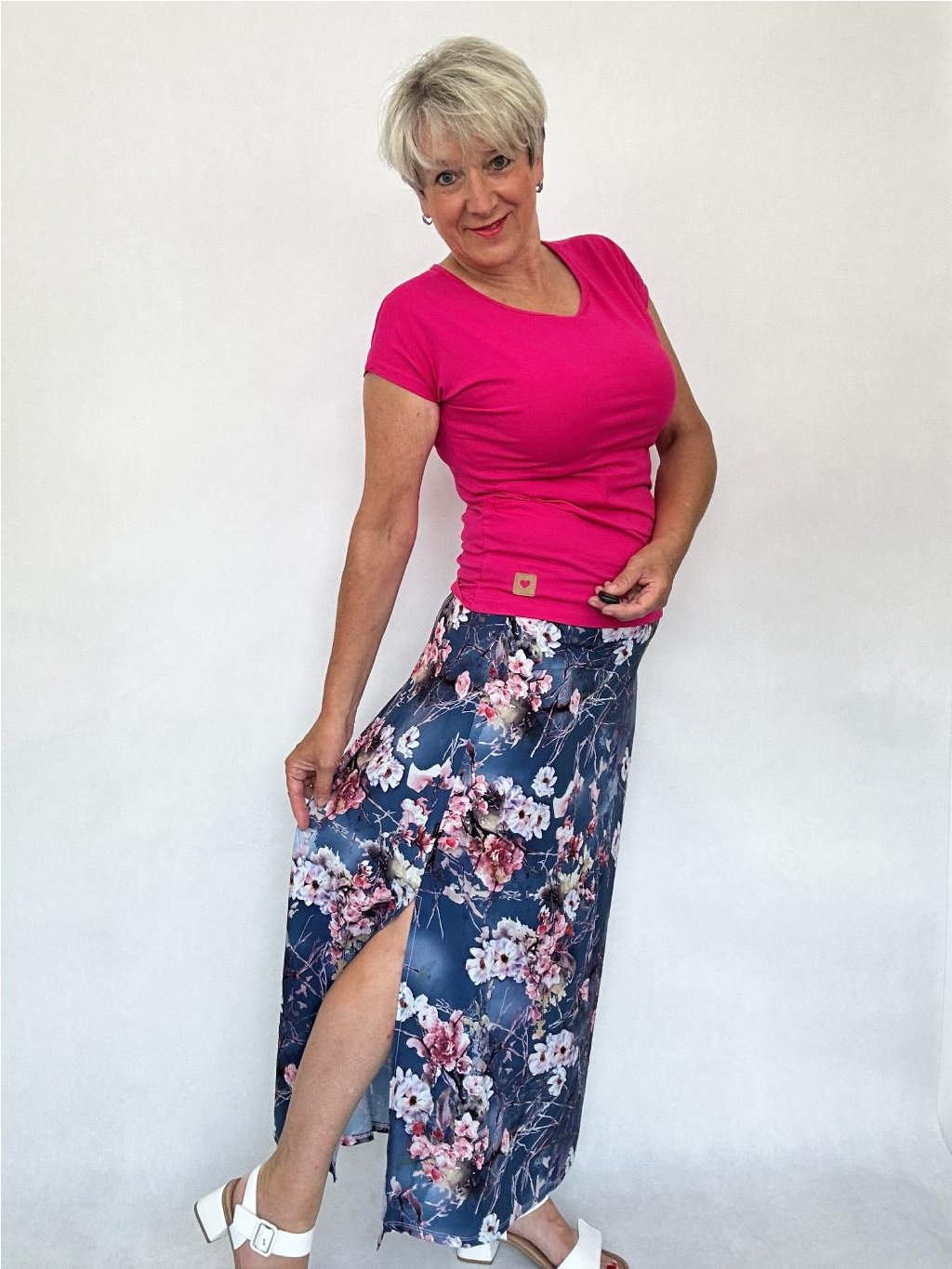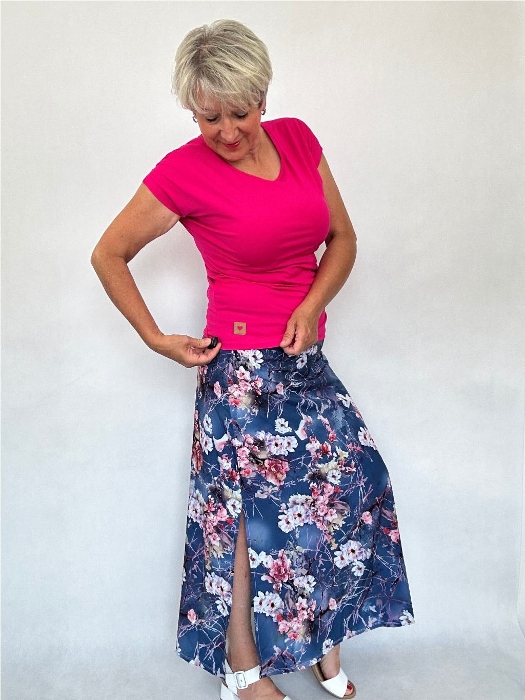 - Sukně má rozparek dlouhý 43 cm, v pase je všitý elastický náplet