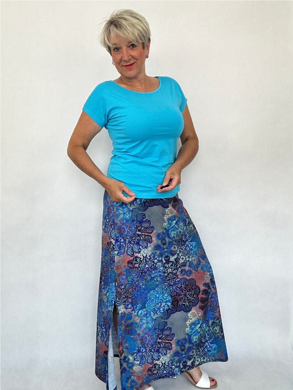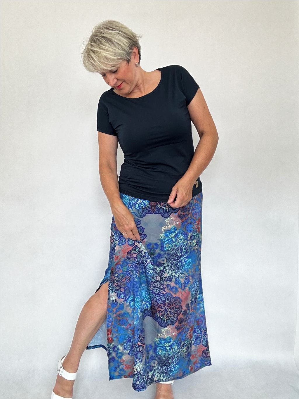 - Sukně má rozparek dlouhý 43 cm, v pase je všitý elastický náplet.