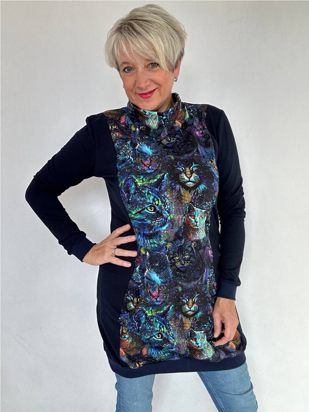 - projmutý střih s barevnou přední částí a tmavě modrými boky = zeštíhlující efekt