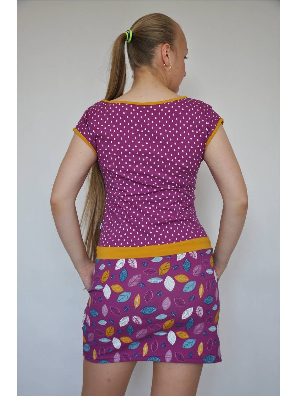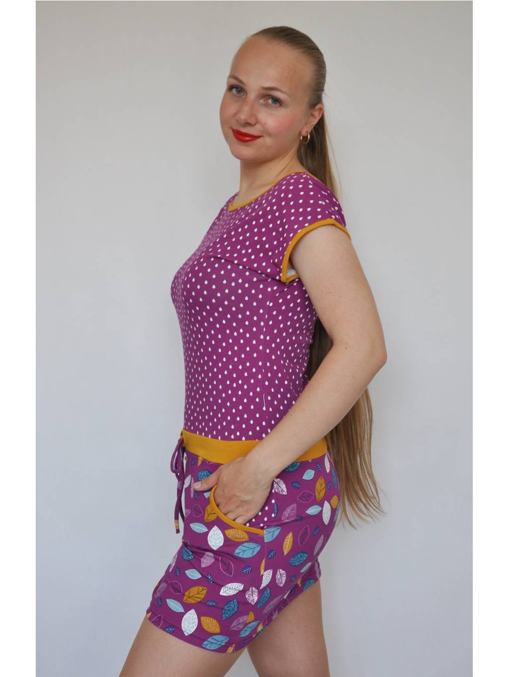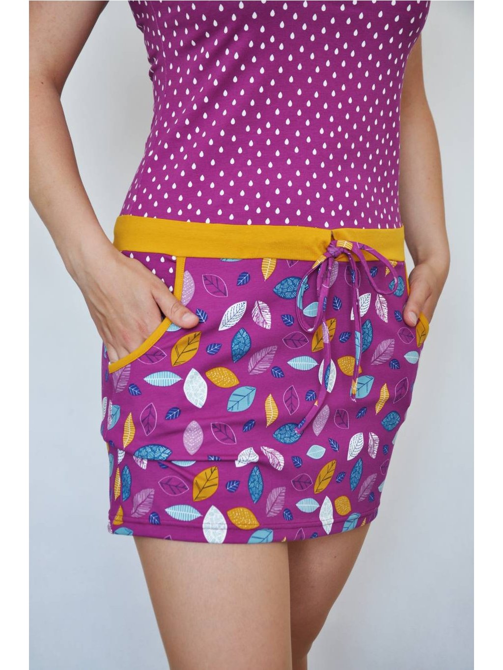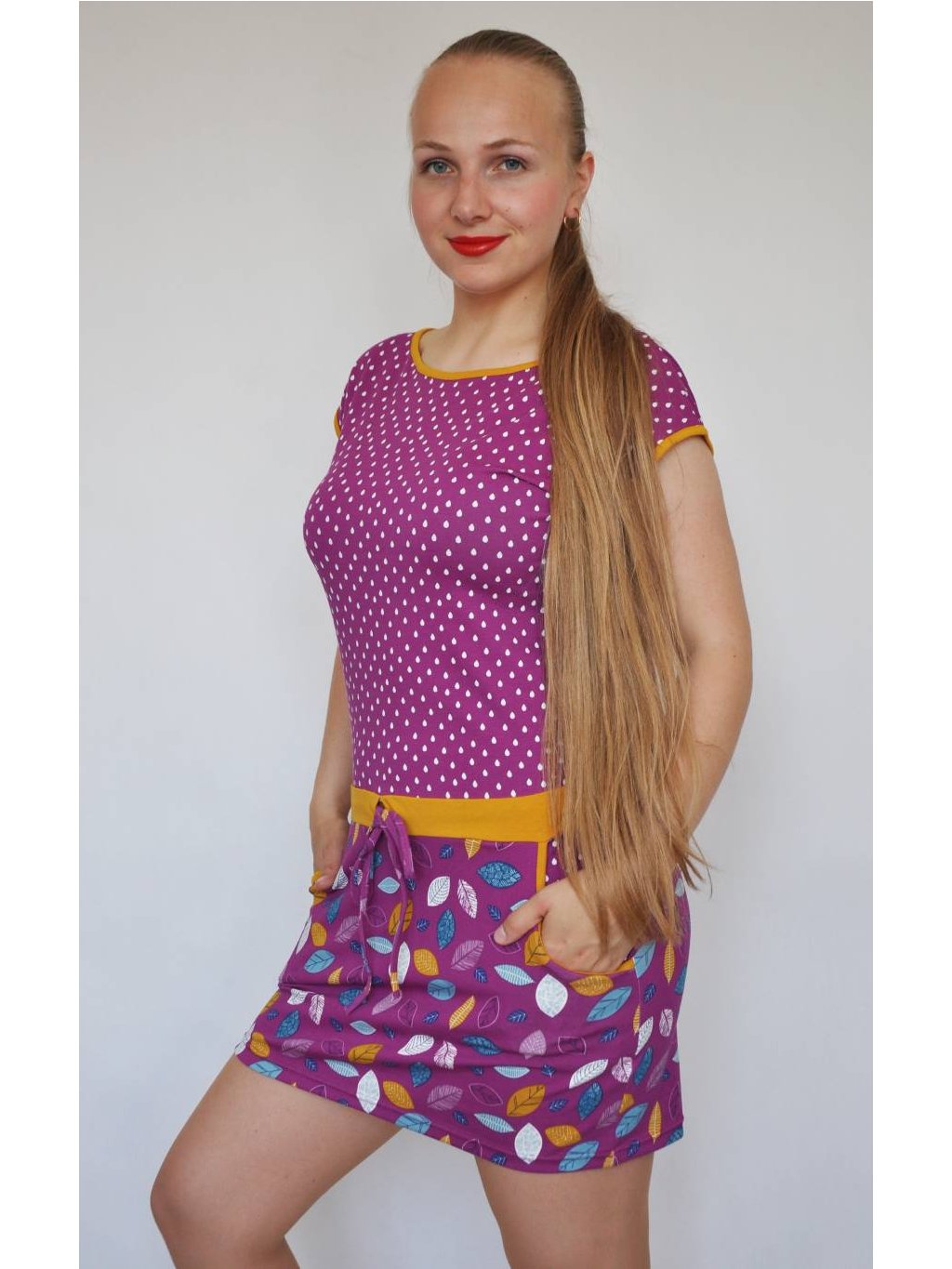 Letní šaty Iris mají kulatý výstřih lemovaný kontrastním úpletem. V pase přestřižené, tunýlek se stužkou na stažení, sukně mírně rozšířená. Spadlý rukáv je lemovaný a šaty mají praktické kapsy. Velmi příjemný materiál - bavlněný úplet.