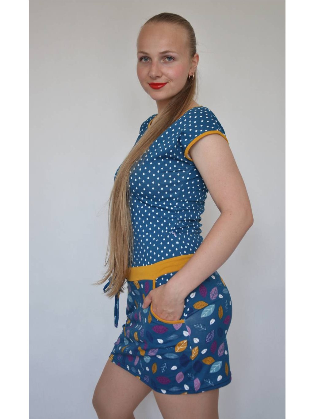 Letní šaty Iris mají kulatý výstřih lemovaný kontrastním úpletem. V pase přestřižené, tunýlek se stužkou na stažení, sukně mírně rozšířená. Spadlý rukáv je lemovaný a šaty mají praktické kapsy. Velmi příjemný materiál - bavlněný úplet.