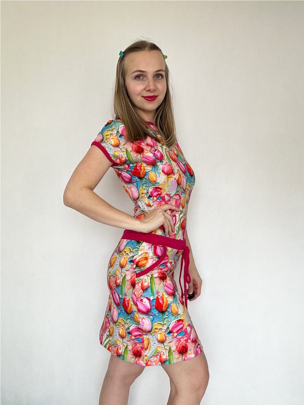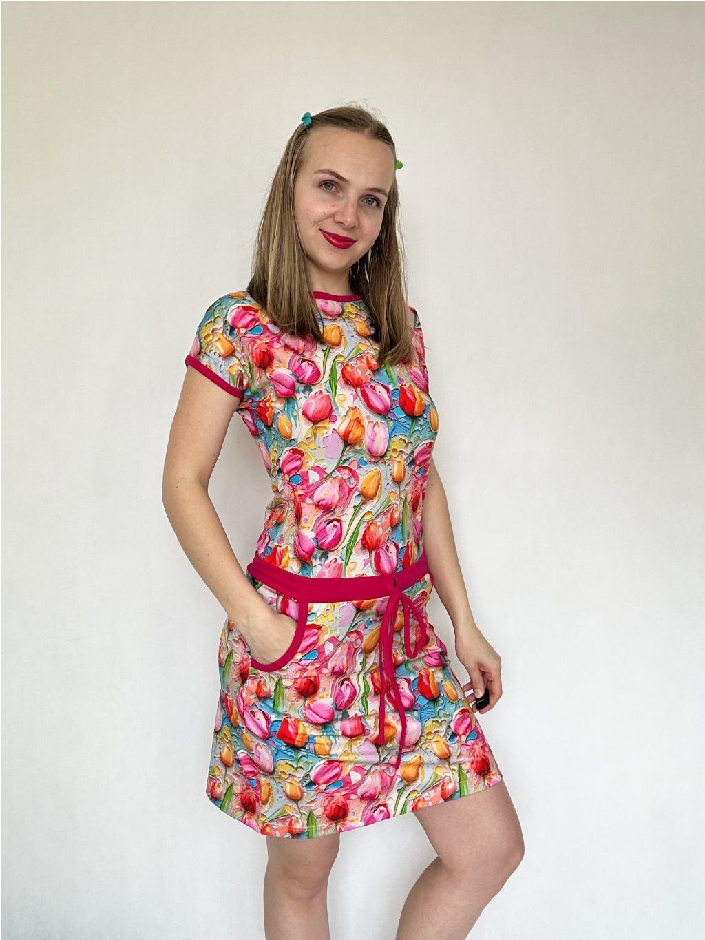 - Spadlý rukáv je lemovaný a šaty mají praktické kapsy.