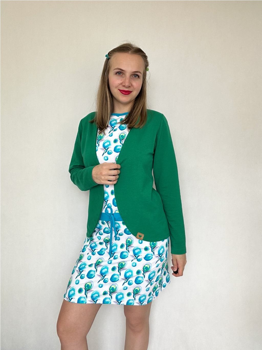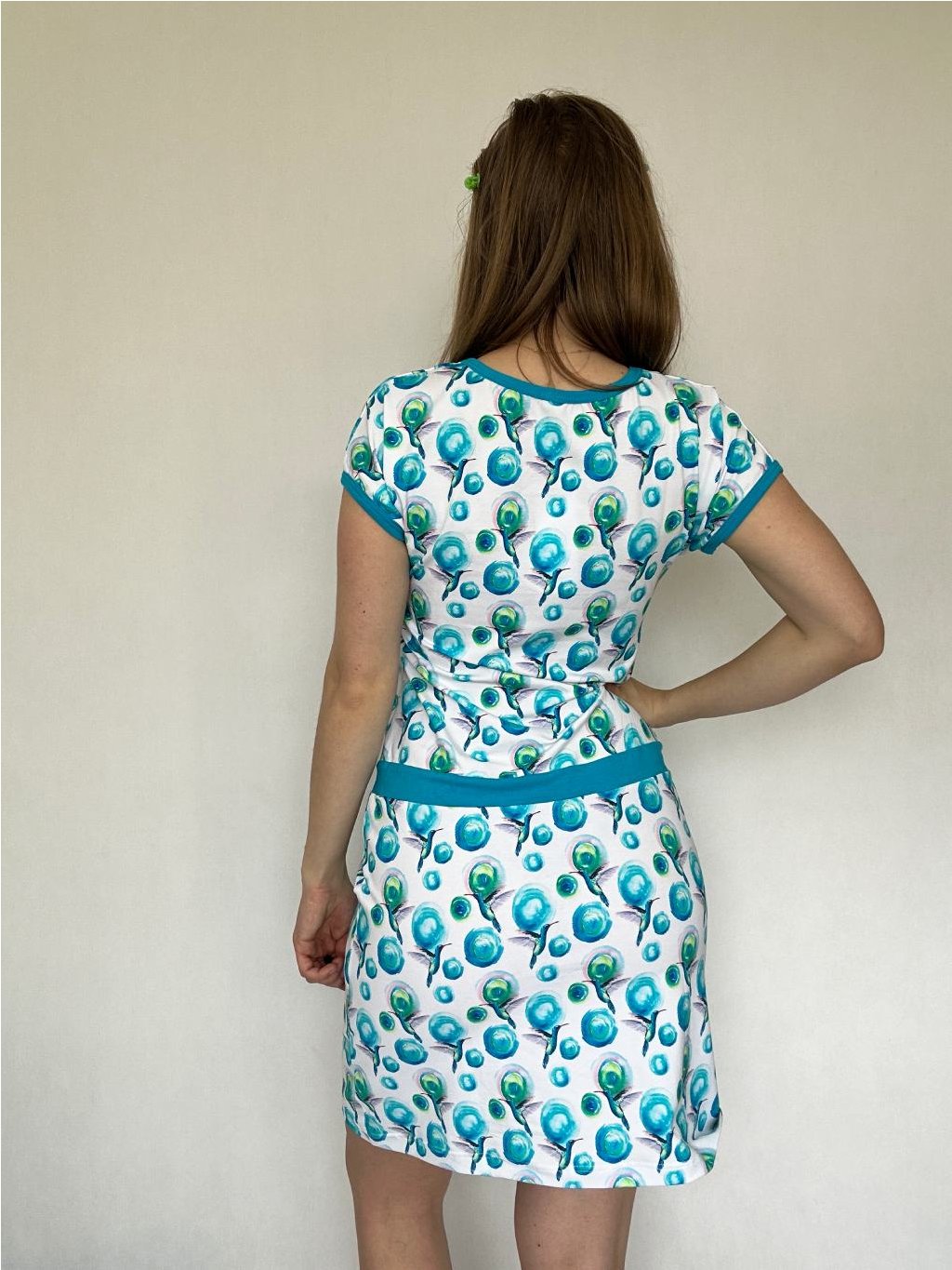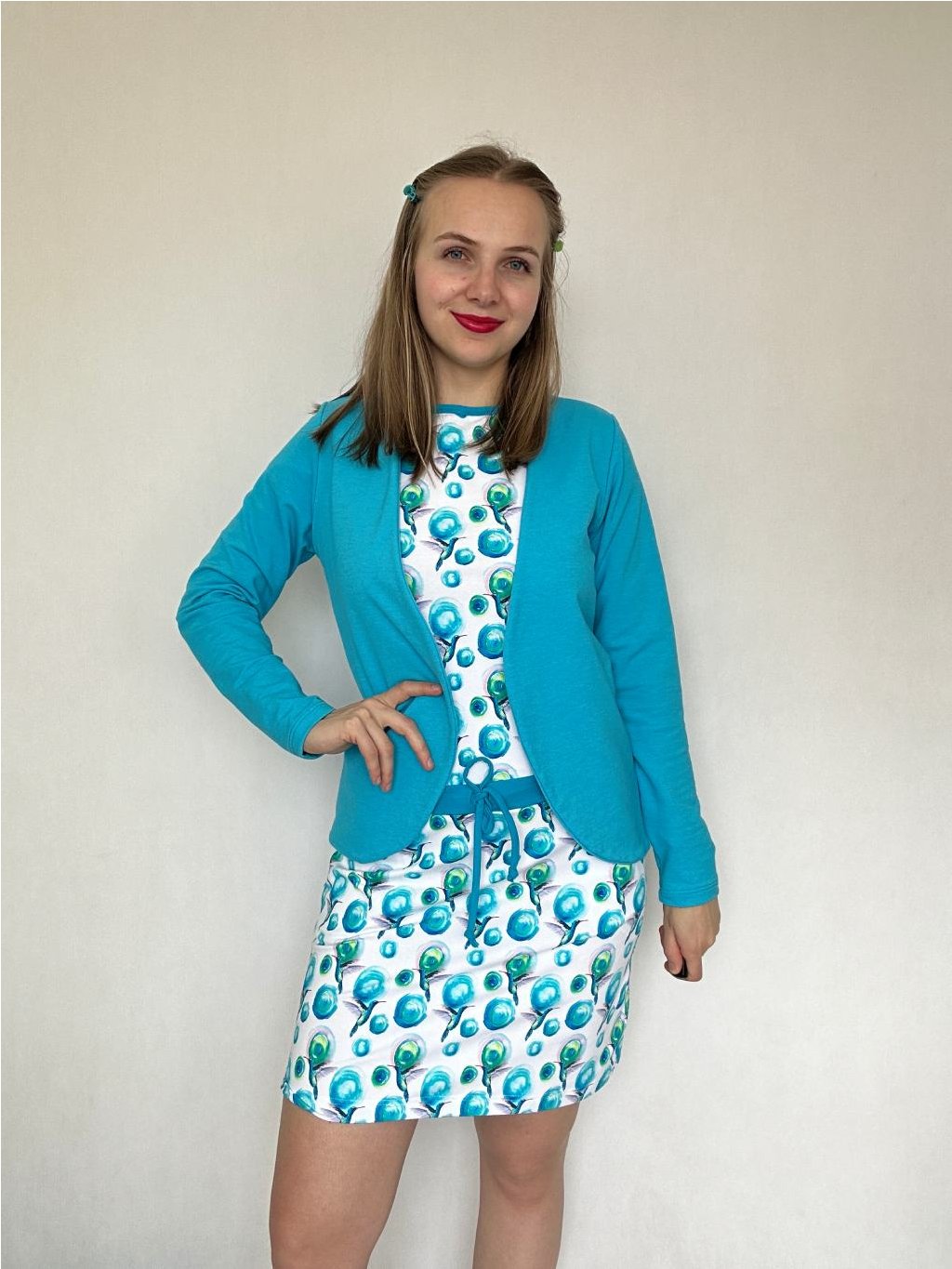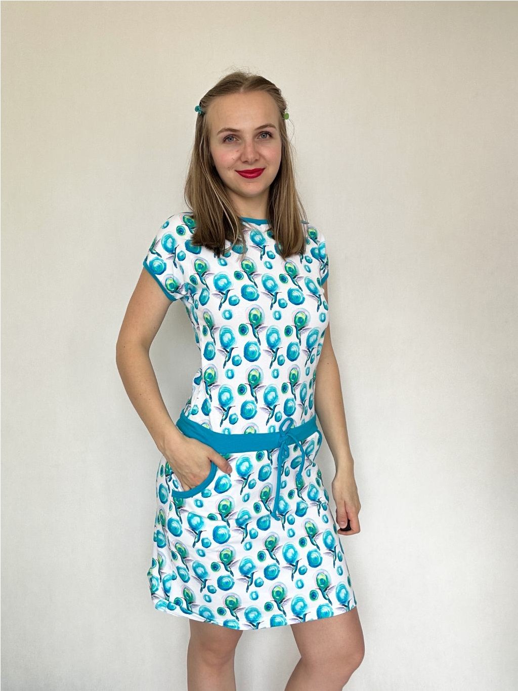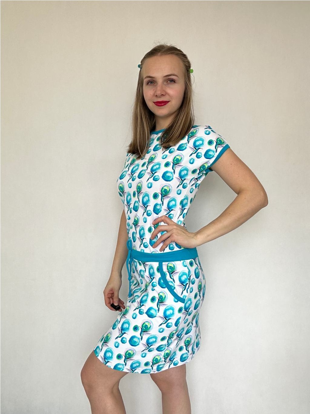 Šaty Iris mají výstřih lemovaný kontrastním úpletem. V pase přestřižené, širší tunýlek se stužkou na stažení, sukně mírně rozšířená. Spadlý rukáv je lemovaný a šaty mají praktické kapsy. Velmi příjemný materiál - bavlněný úplet. K šatům se vám hodí blejzr, které mám ve spoustu barev a odstínech,