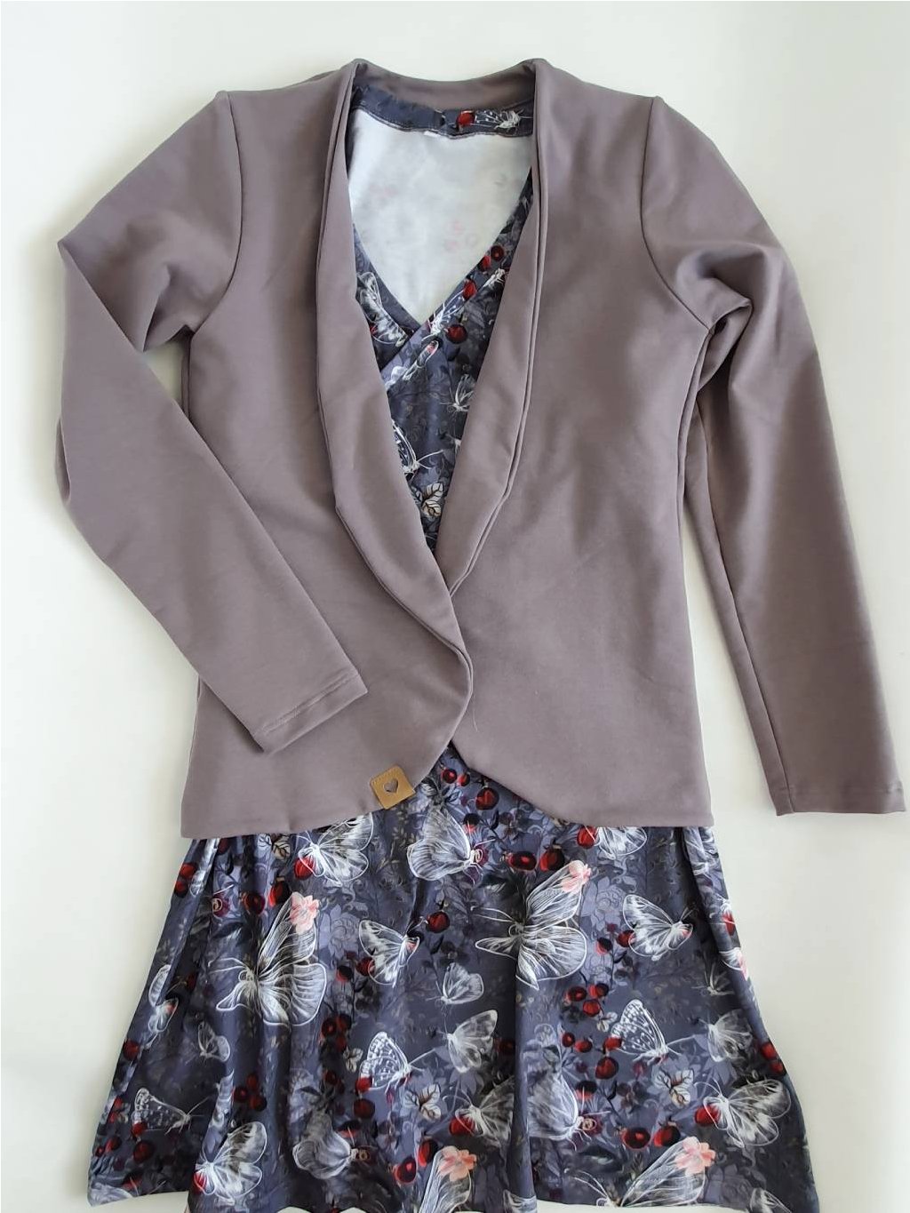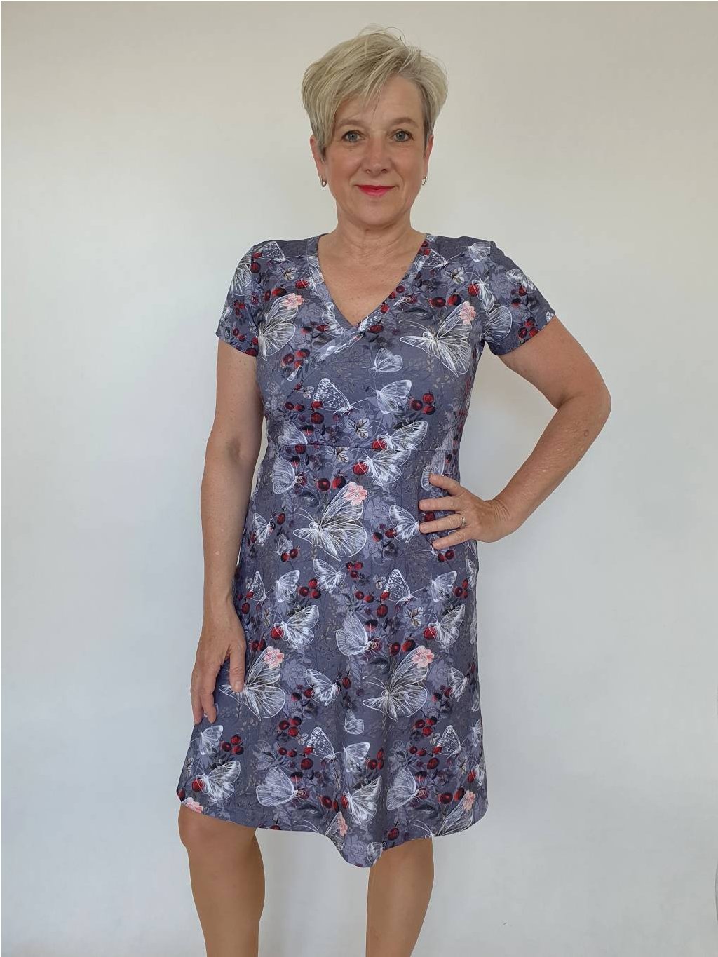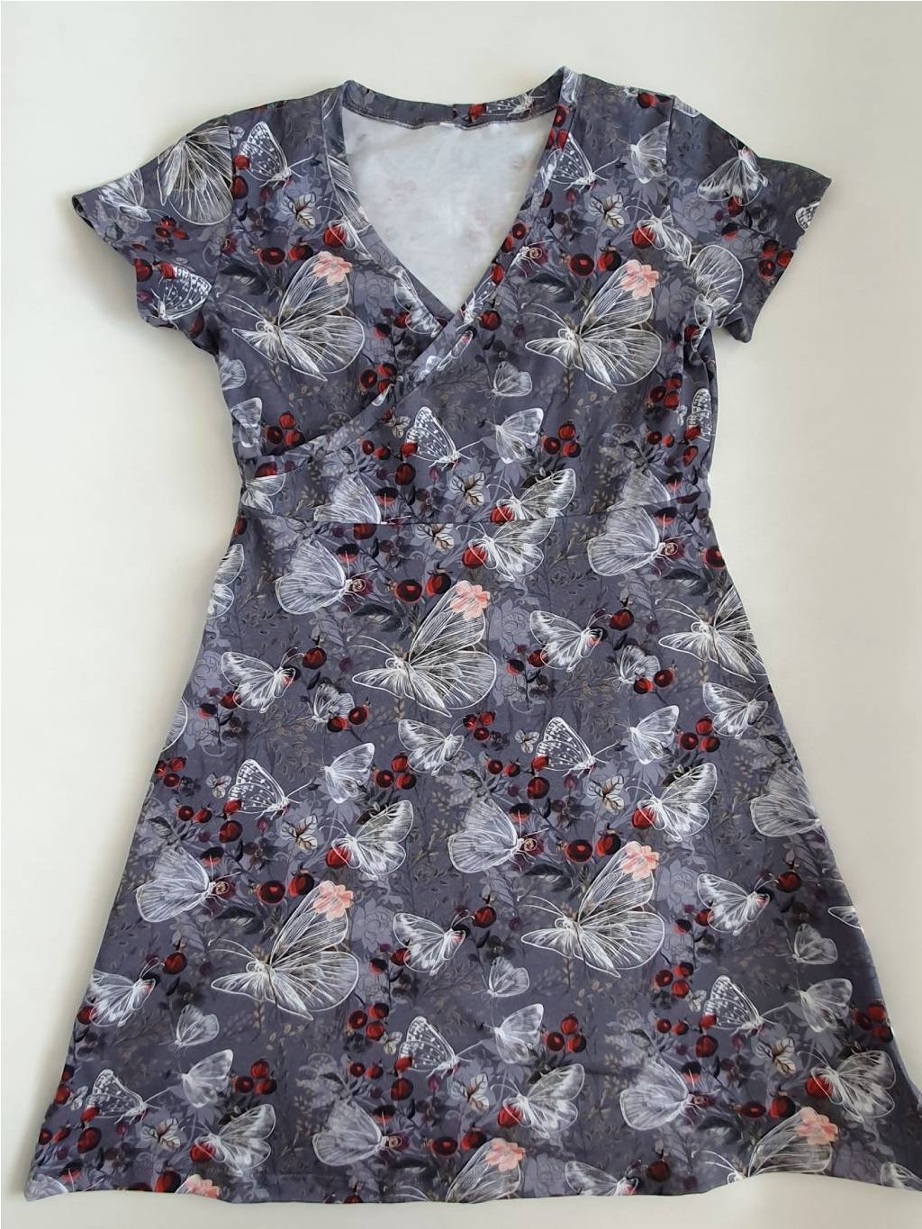 Šaty Katka s kříženým předním dílem, půlkolovou vzdušnou sukní a krátkým rukávem. Ušité jsou z bavlněného elastického úpletu a mají lemování po celé délce křížení. Šaty krásně padnou na větší i menší poprsí (testováno na zákaznicích) a pod prsy jsou přestřižené. Spodní díl je šitý do mírného áčka, které lichotí postavě a leccos zakryje. Nosit můžete k teniskám a nebo využít jako společenské s blejzrem