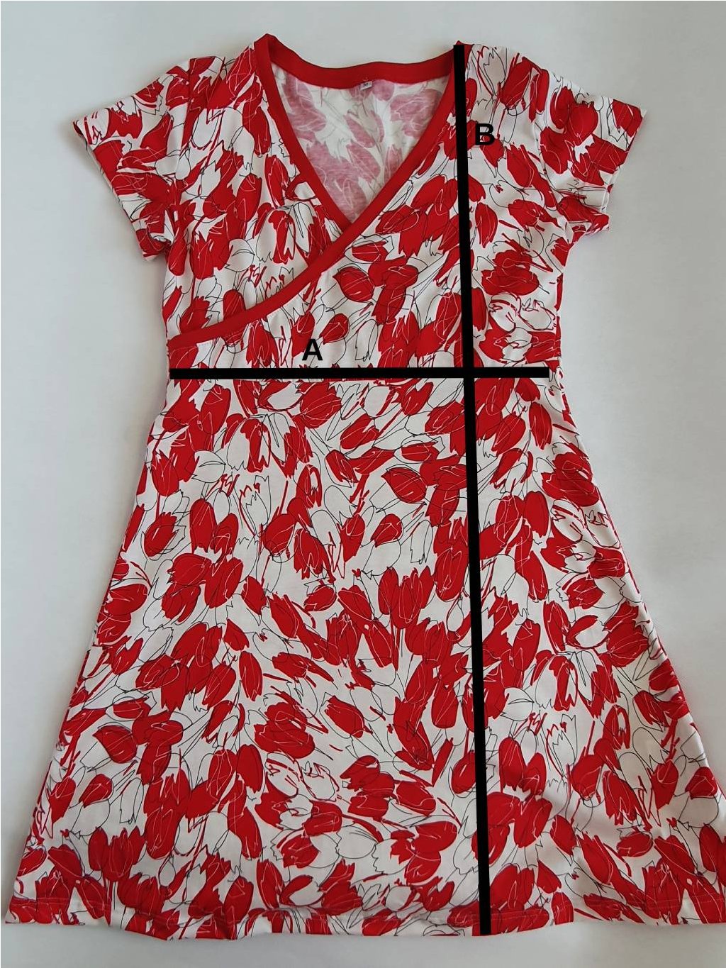 A - měřeno pod prsy, B - délka šatů ( vše měřeno na volně položených šatech, viz. foto)