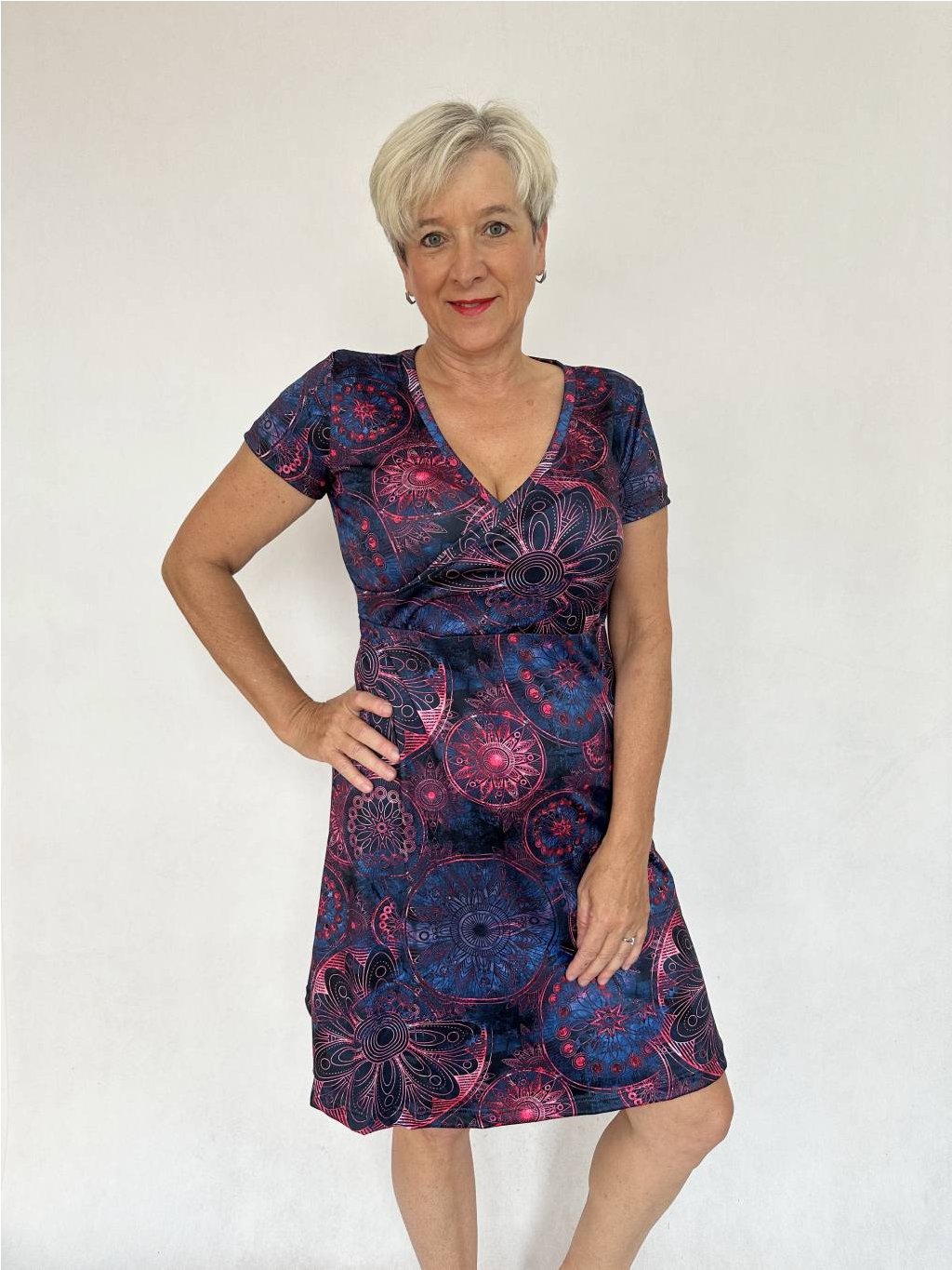 - Šaty Katka s kříženým předním dílem, půlkolovou vzdušnou sukní a krátkým rukávem.