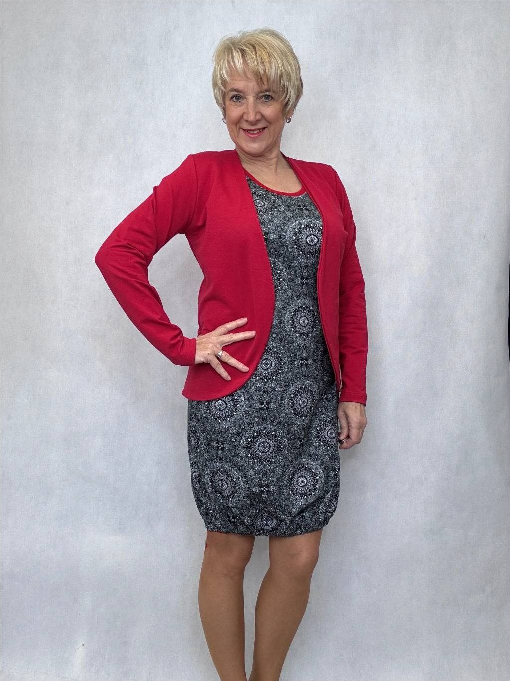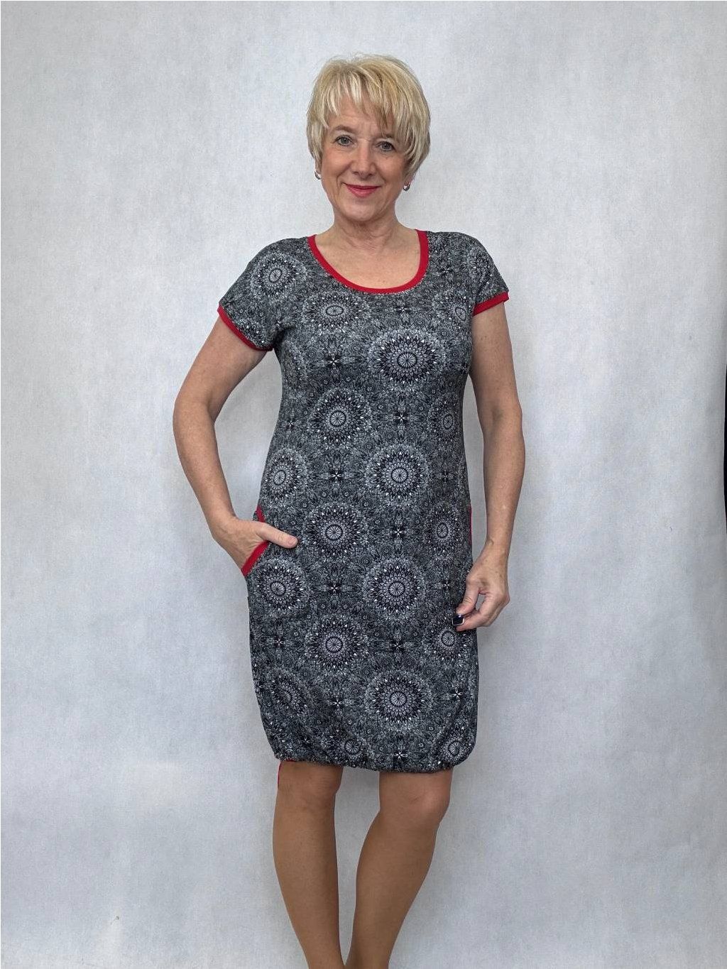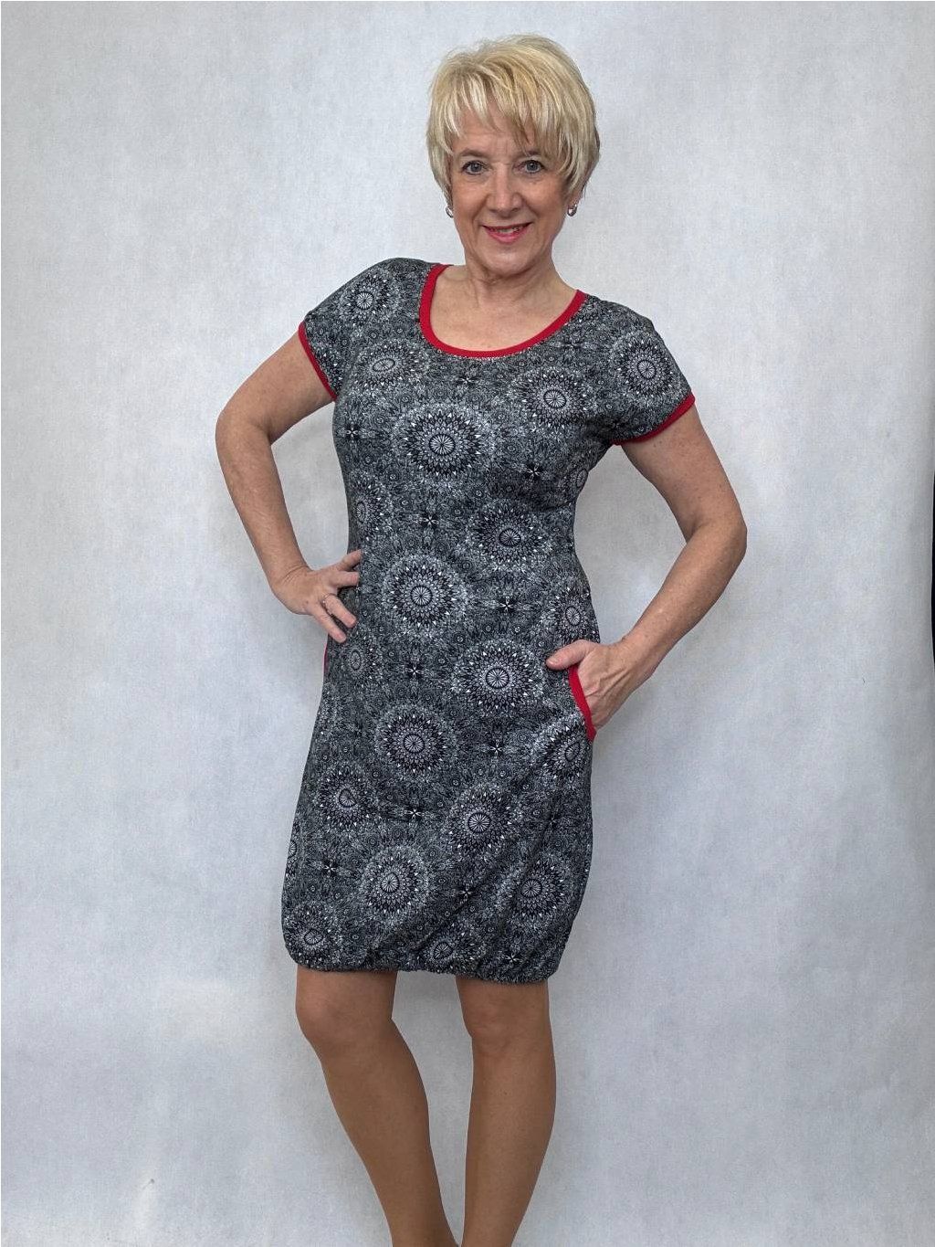 Šaty se skvěle kombinují k legínám a pokud zvolíte silonky máte elegantní outfit třeba s jednobarevným blejzrem. Jsou ušité z bavlněného pružného úpletu a jsou maximálně pohodlné. Šaty Nora mají kulatý výstřih lemovaný nápletem. Střih je dole stažen do šňůrky, pokud šňůrku vytáhnete, jsou šaty mírně rozšířené. Spadlý rukáv je olemovaný také nápletem a šaty mají praktické kapsy. Jsou ušité ve volném střihu s krátkou délkou nad kolena. Díky pružnému materiálu vám skvěle padnou a přizpůsobí se každému pohybu.