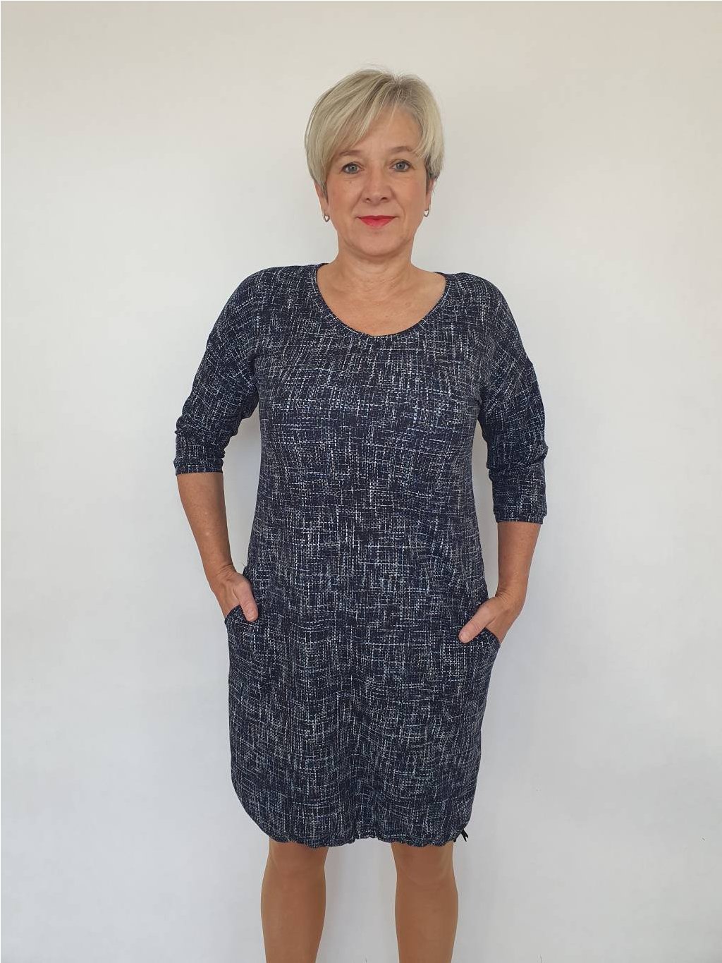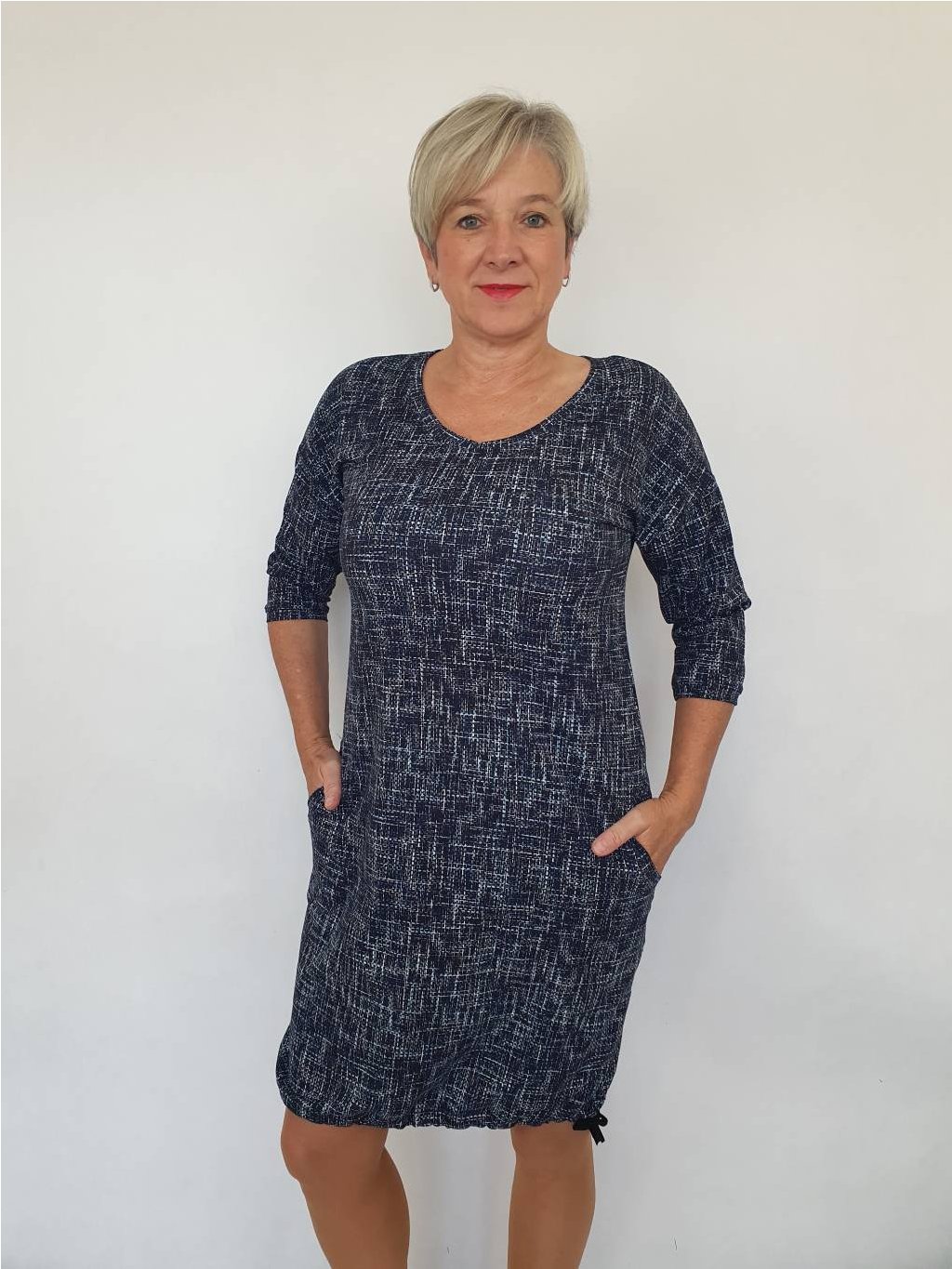 Šaty Nora mají kulatý výstřih, kapsy, dole jsou šaty stažené, pokud šňůrku z tunýlku vytáhnete, máte šaty mírně rozšířeného střihu. Velmi příjemný materiál - bavlněný silnější úplet.