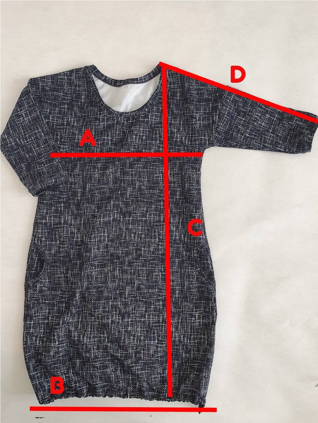 Rozměry: A - obvod hrudníku , B - spodní šířka nestažená, C - délka, D - délka rukávu, měřte vaše oblíbené šaty, tričko - viz foto