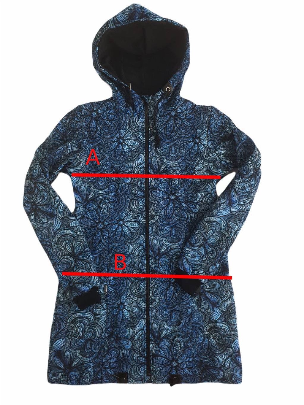XL: A - obvod hrudníku 118 cm, B - boky 126 cm, celková délka (měřen zadní díl) 87 cm