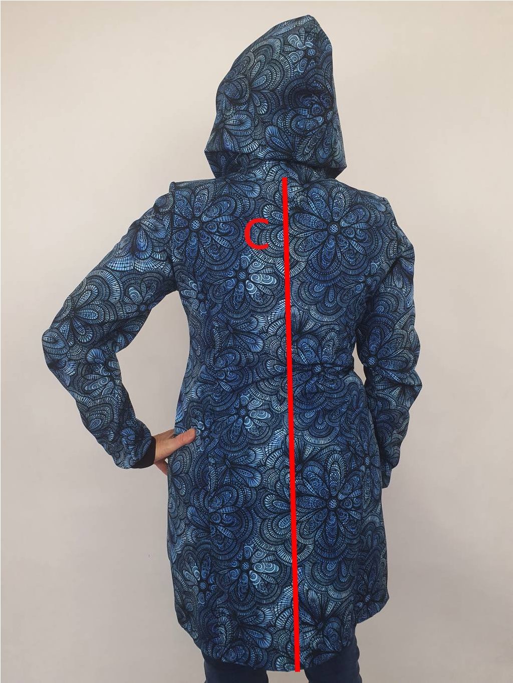 S: A - obvod hrudníku 100 cm, B - boky 110 cm, C - celková délka (měřen zadní díl) 87 cm