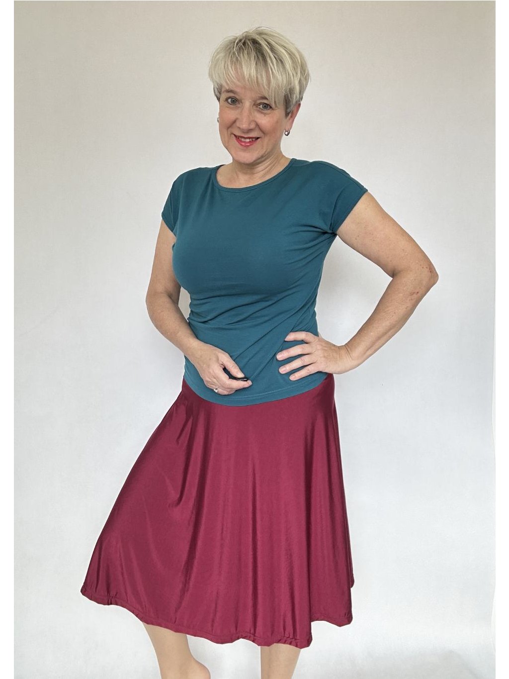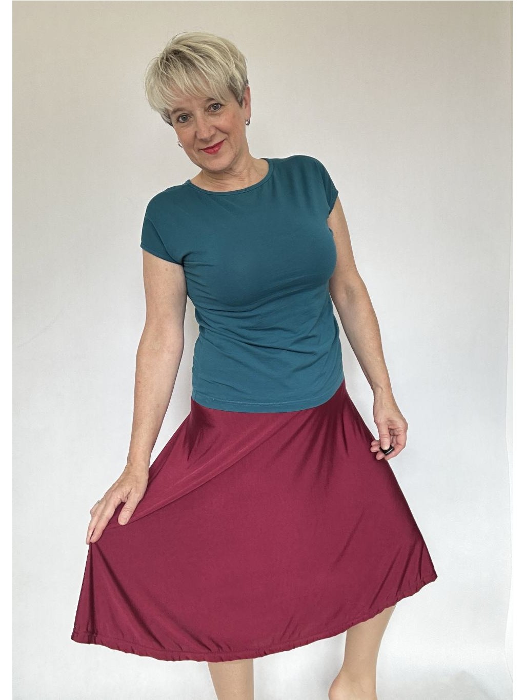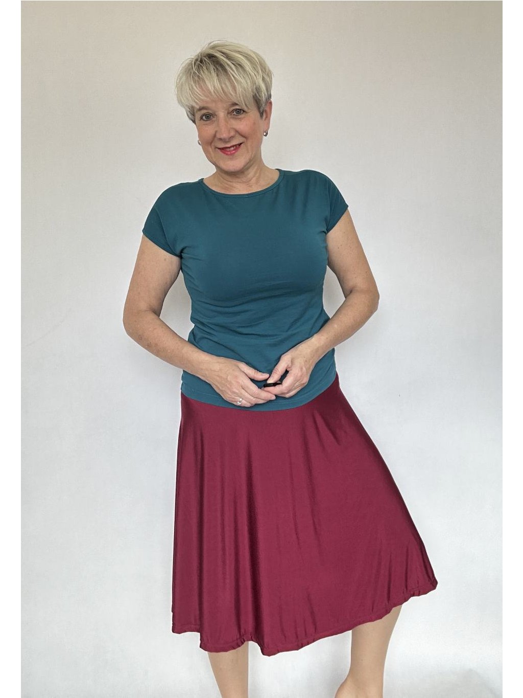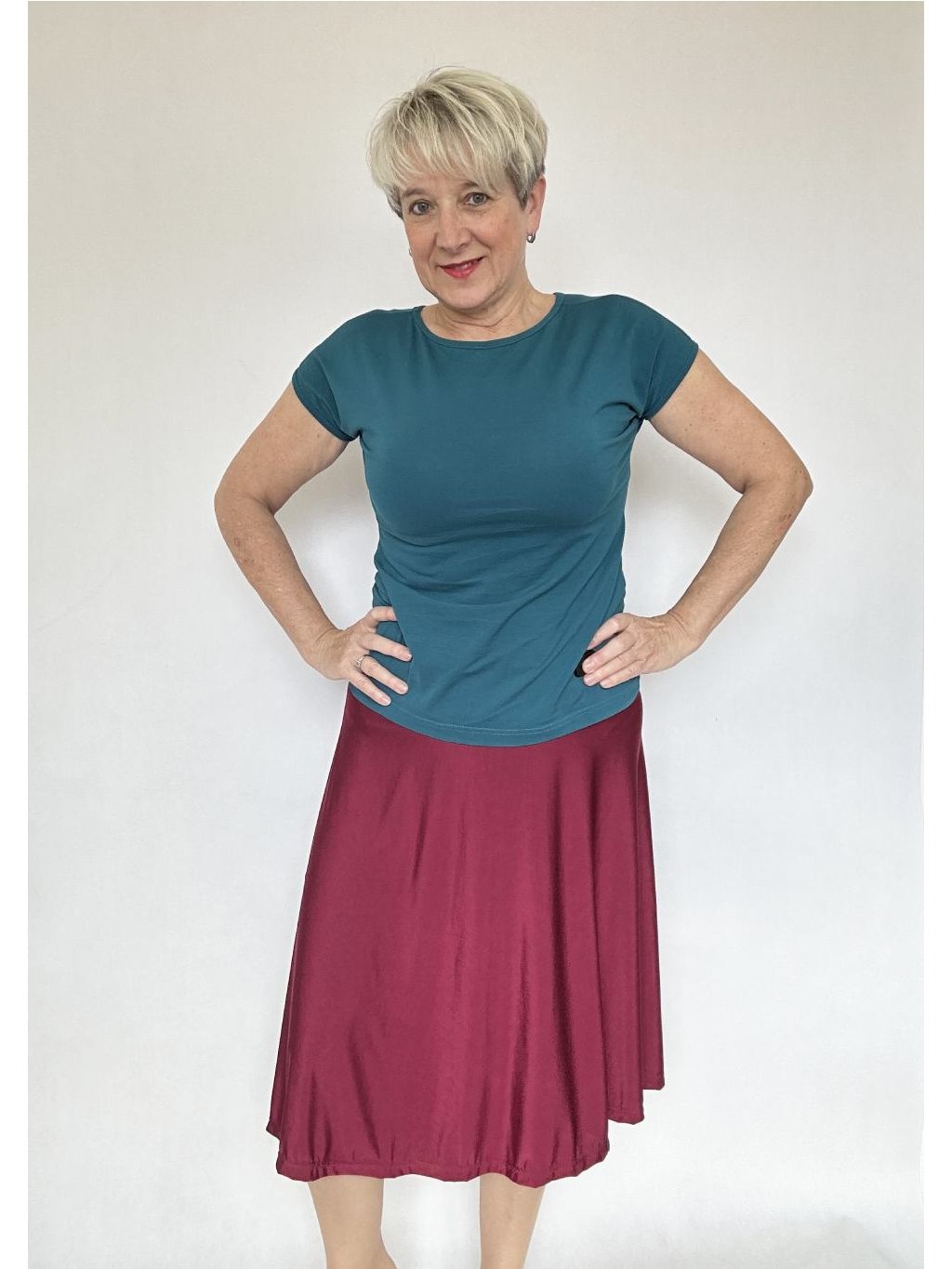 - Délku sukně lze regulovat i tím, že elastický náplet v pase přehnete napůl.