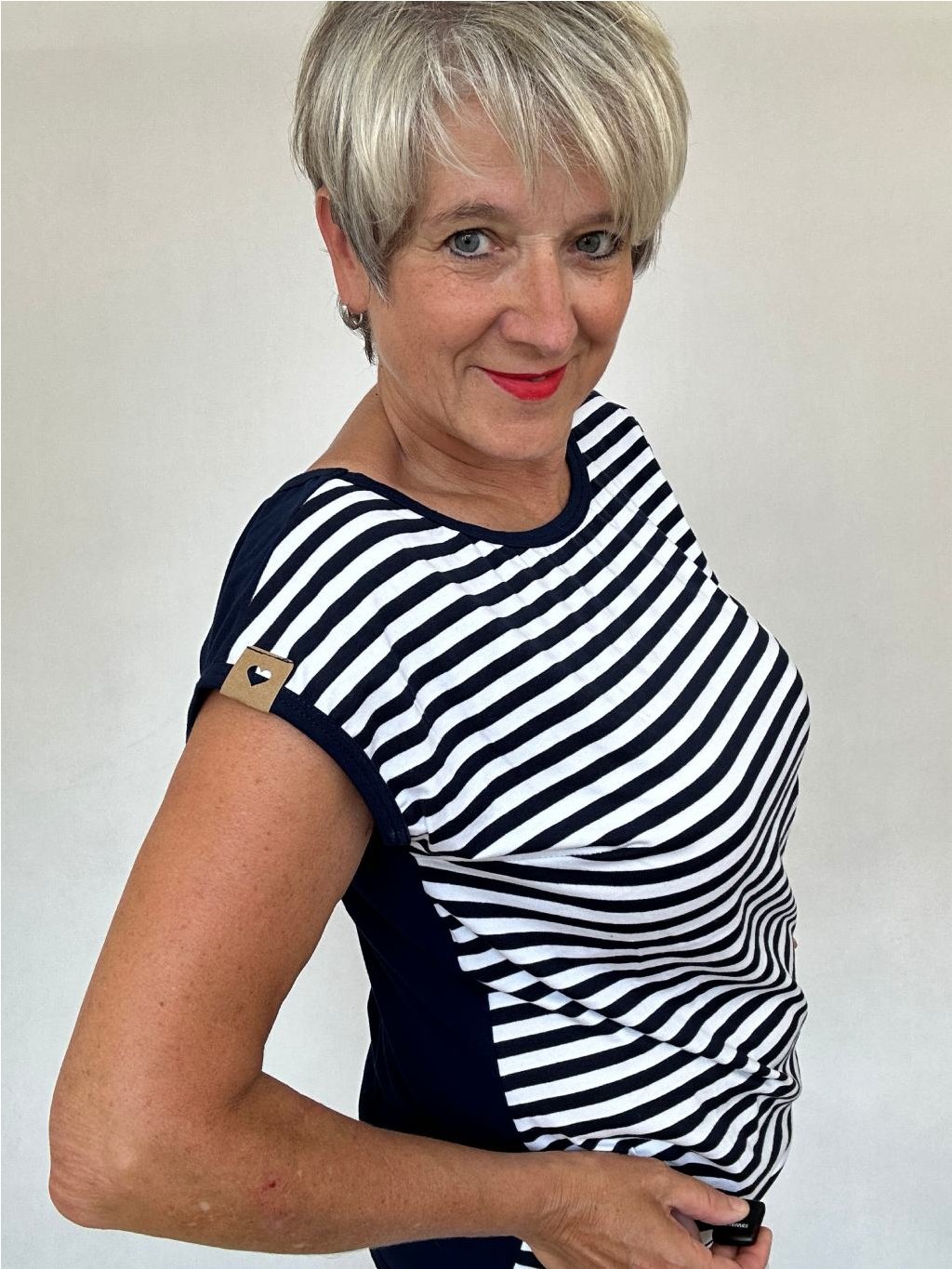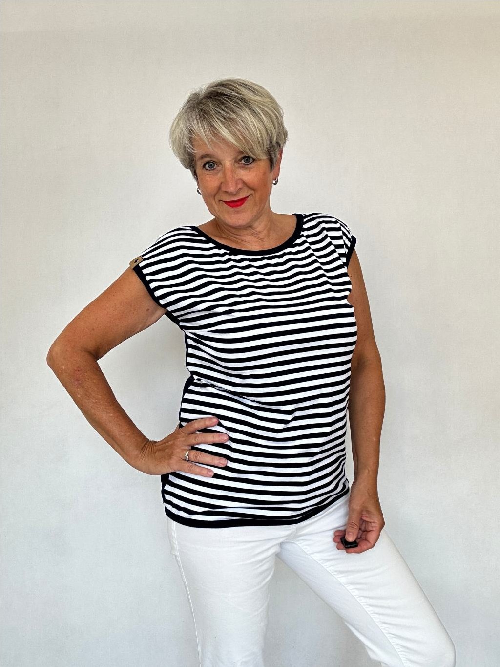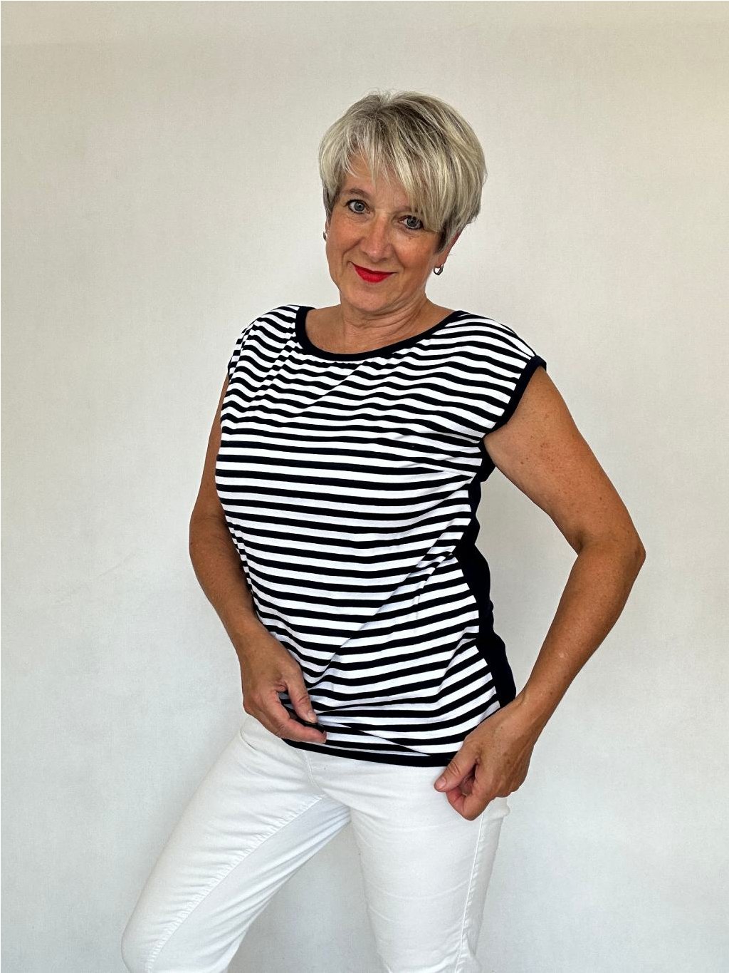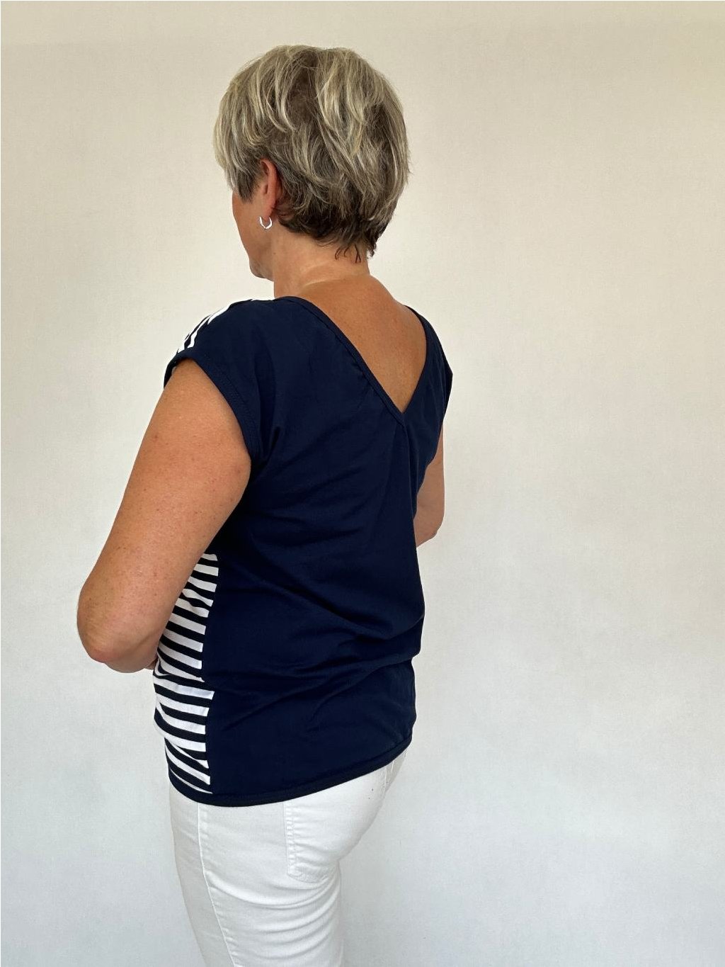 Představuji vám nový střih - tričko ESTER, které vás zaručeně okouzlí. Volnější střih a příjemný materiál vám zajistí maximální pohodlí po celý den. Přední díl z bavlněného úpletu s tmavě modrou proužkou dodává tričku luxusní vzhled, zatímco zadní díl má efektní výstřih do "véčka". Přední díl má prsní záševky, aby tričko dobře sedělo. Krátké rukávy a výstřih ve tvaru 'véčka' na zadní straně dodávají tričku šarm a lehkost. Díky jemnému pružnému stažení dole vytváří tričko podkasaný efekt, který elegantně maskuje případné nedostatky, jako je třeba větší bříško. Skvělé, že?"