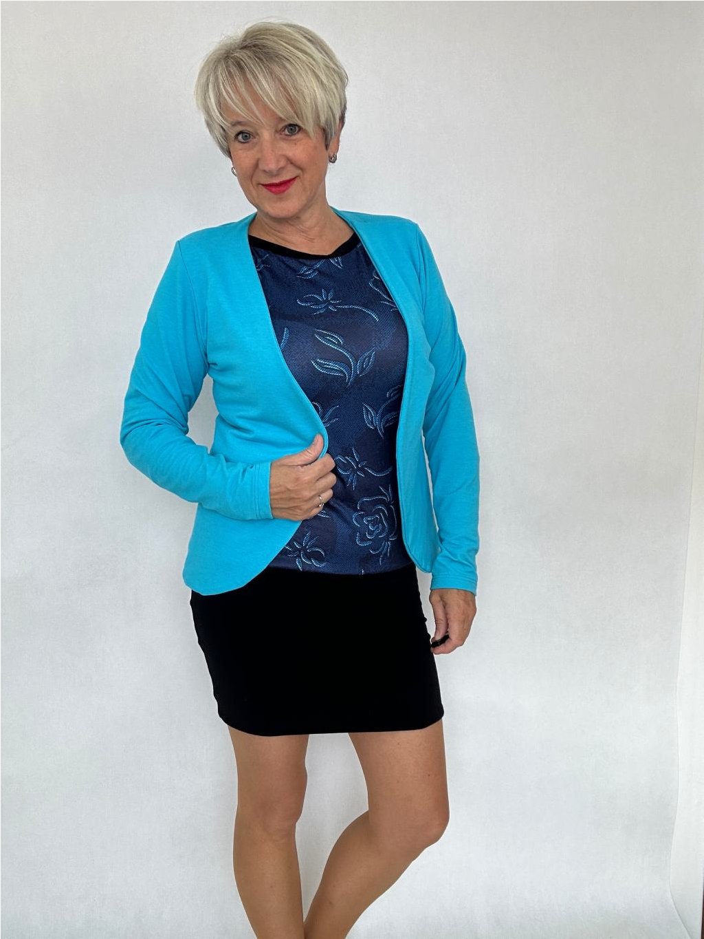 S: obvod hrudníku 94 cm, boky 82 cm, délka rukávu 60 cm, zadní délka 84 cm